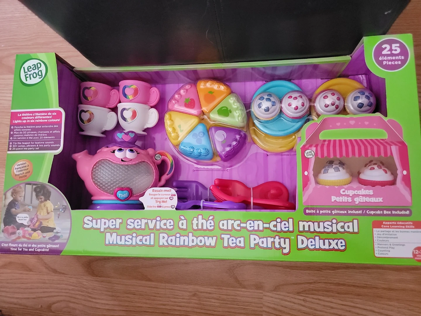 Get ready for a tea party with this LeapFrog Musical Rainbow Tea Party Deluxe set! It comes with 25 pieces, including a teapot that lights up in six rainbow colours and makes realistic sounds. The set also includes cupcakes and a cupcake box, perfect for pretend play and learning about sharing, manners, and counting. Box included!