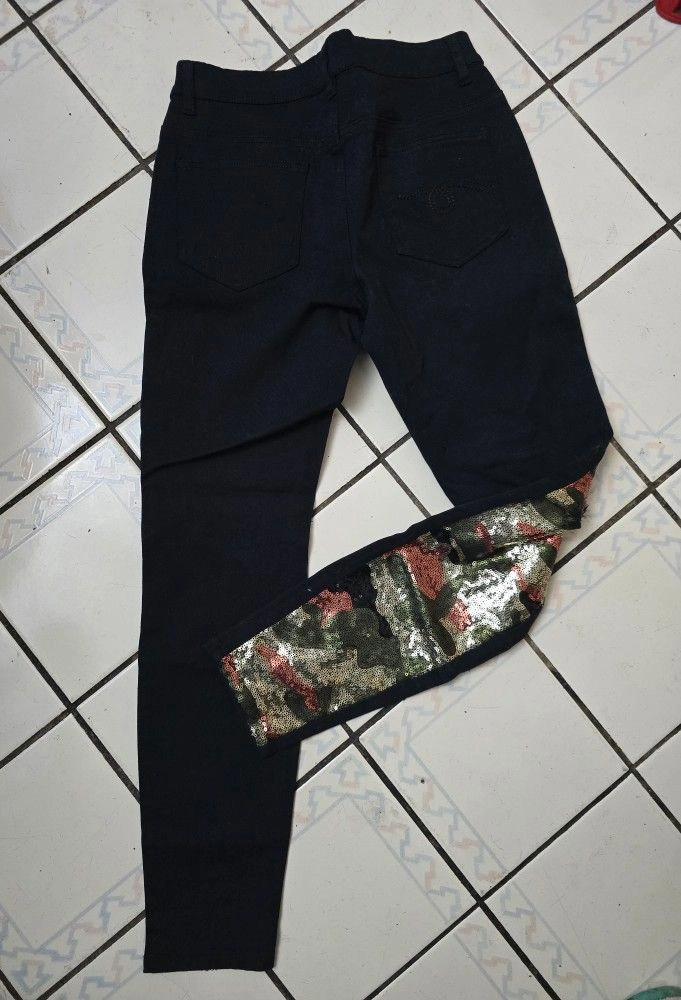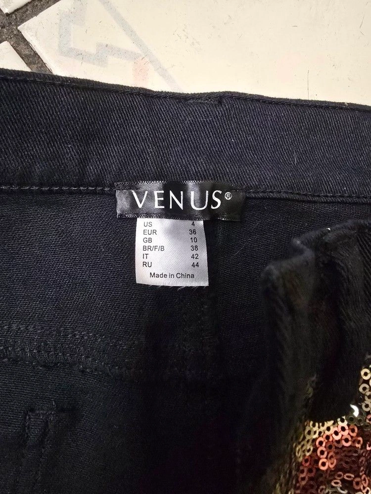 Elevate your wardrobe with these stunning Venus stretch ankle pants. The black denim fabric is adorned with sparkling mini sequins, adding a touch of glamour to any casual occasion. The pants feature a zip and button closure, as well as pockets for added convenience.