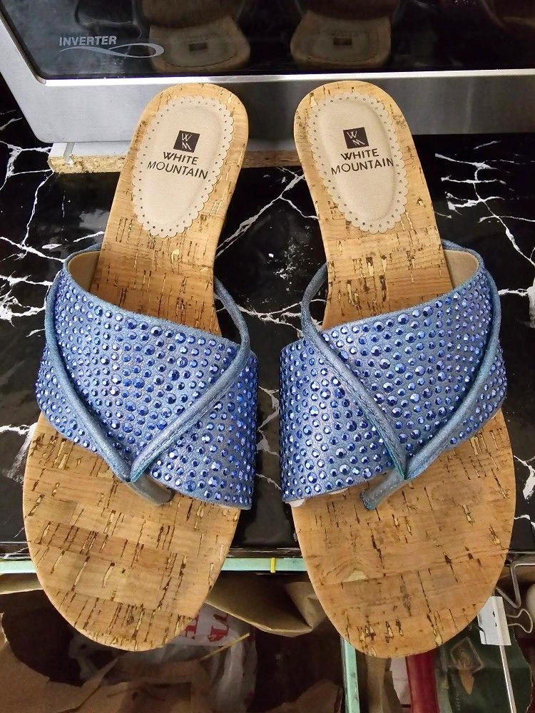 These White Mountain ladies' slide sandals are the perfect addition to any casual outfit. The pink and blue colors with added glitter and studs make them a fun and stylish choice for the spring and summer seasons. The shoes are made with a fabric upper and synthetic outsole for durability and comfort.