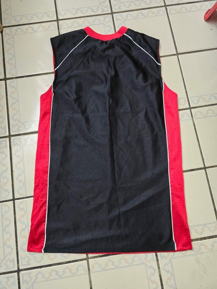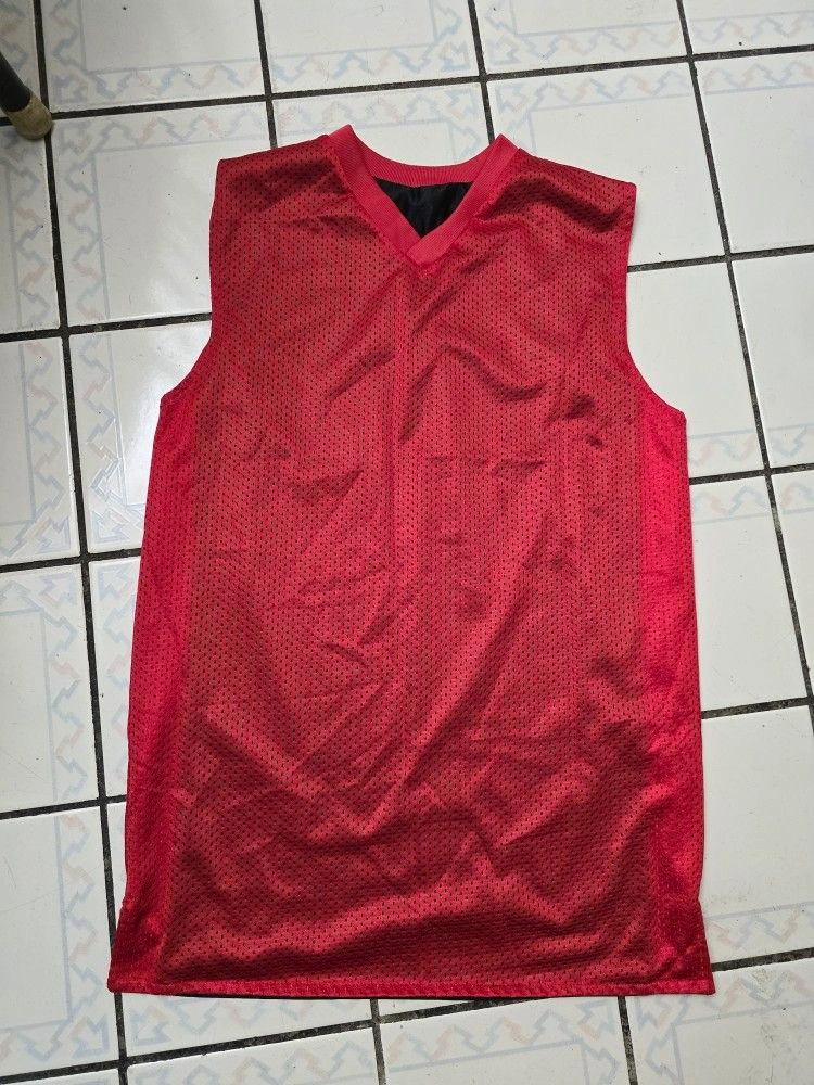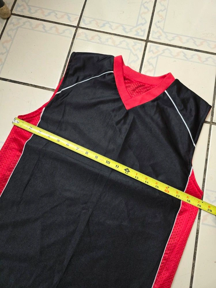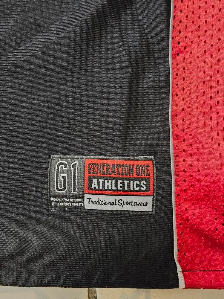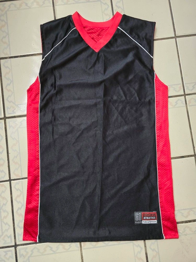 This is a vintage Generation One Athletics Basketball Jersey that is reversible, black in front, red in reverse. It is made of polyester and nylon jersey fabric with a red, black, and white solid pattern. The jersey has a V-neckline and is sleeveless, making it suitable for summer. It is a regular fit and comes in size small. The jersey is easy to care for and can be machine washed. It has no graphic print or personalization and is not subject to California Prop 65 warning. The jersey is part of the Generation One product line and has an athletic and basketball theme.