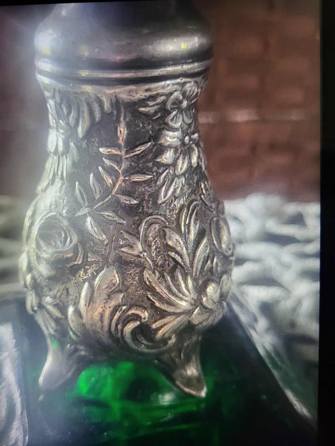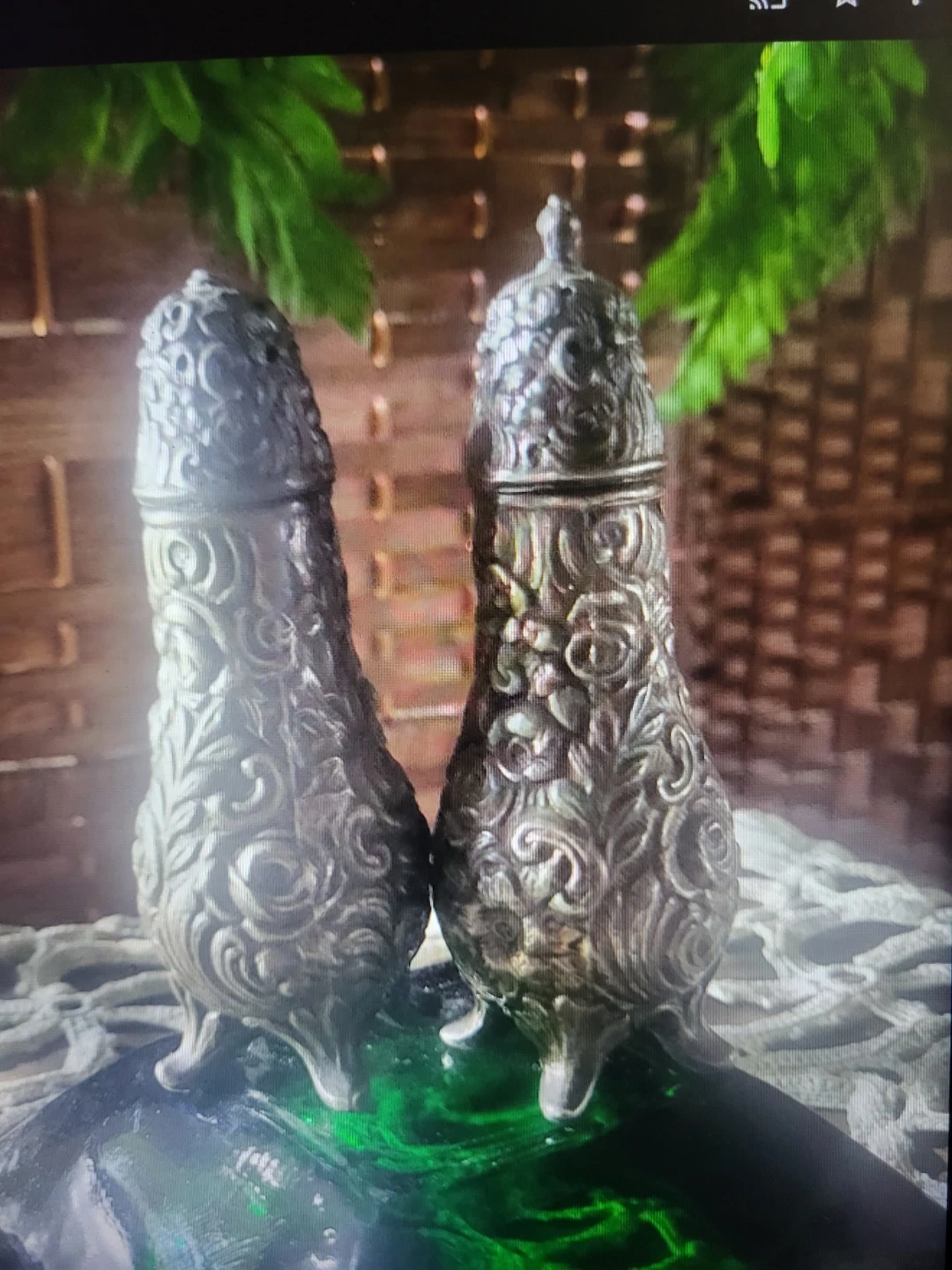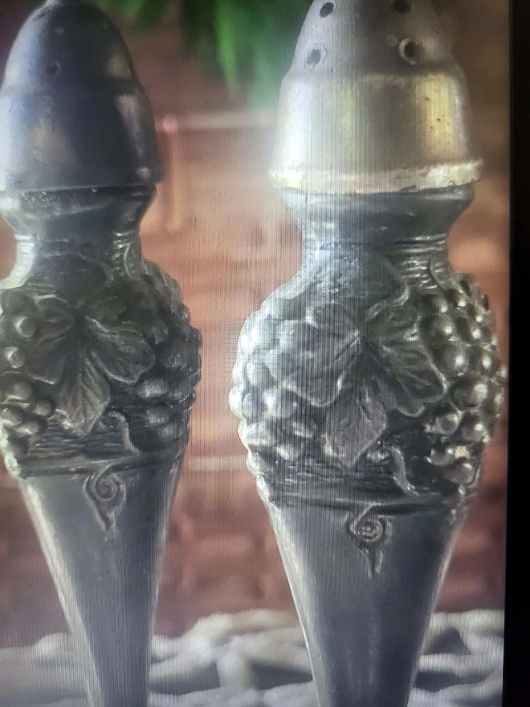 Selling a pair of vintage silver-plated salt and pepper shakers. They have a beautiful, ornate design with floral and grape motifs. These would add a touch of elegance to any table setting!