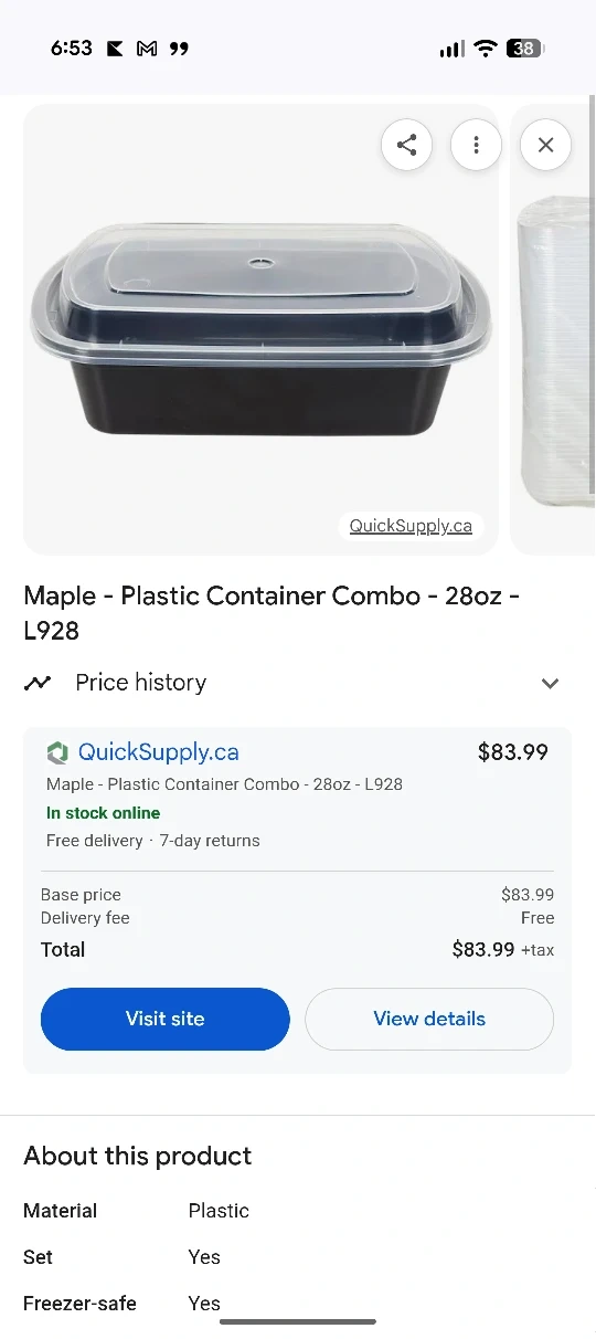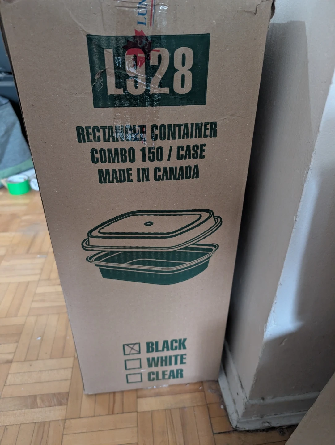 Selling a case of Maple Leaf L928 rectangle containers. The box indicates it's a combo of 150 containers. They are made in Canada. Pick up only. Near Malvern Mall. Cash only. Price is firm.