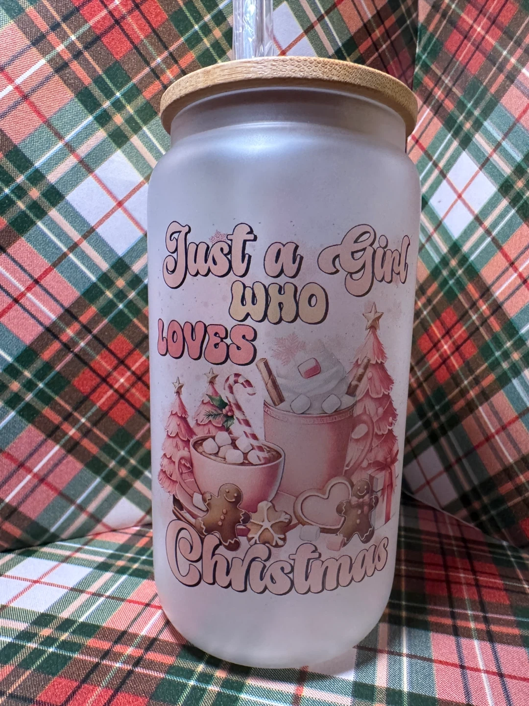 This frosted glass tumbler is perfect for the holiday season! It features a cute design with Christmas trees, gingerbread cookies, and hot cocoa. It's a great way to enjoy your favourite drinks in style during the holidays