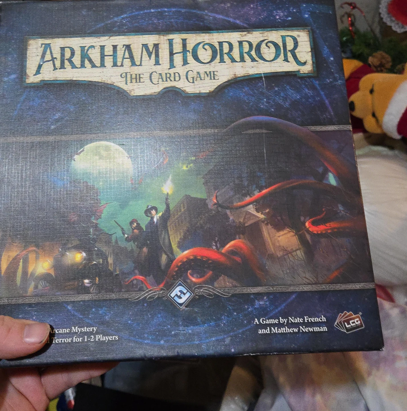 Selling Arkham Horror: The Card Game! It's a game by Nate French and Matthew Newman, perfect for 1-2 players who enjoy arcane mysteries. The box is included.