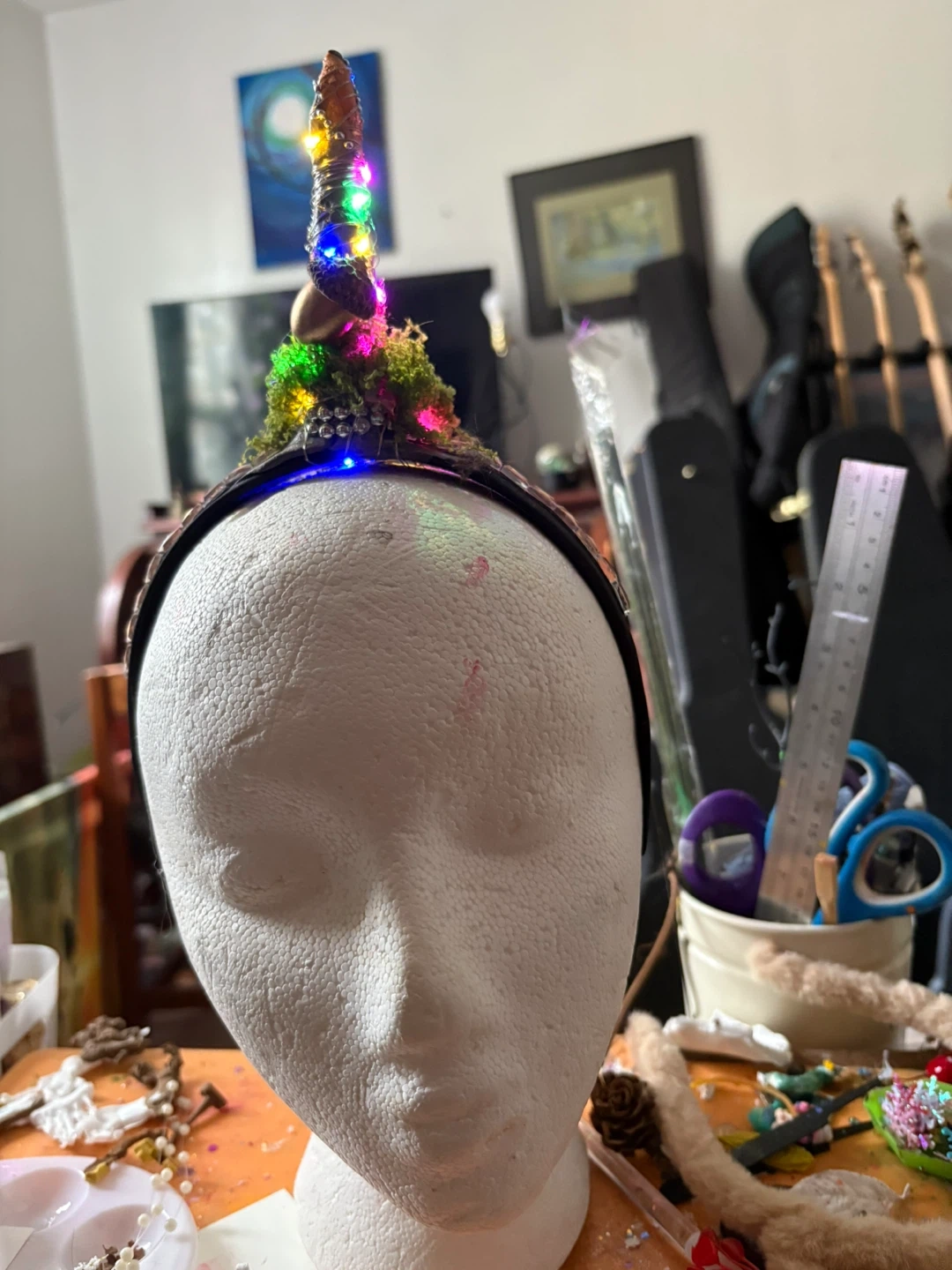 Selling a cute, unique, handmade unicorn headband! It features a decorative horn with moss and colourful lights. Perfect for parties or just adding a bit of whimsy to your day