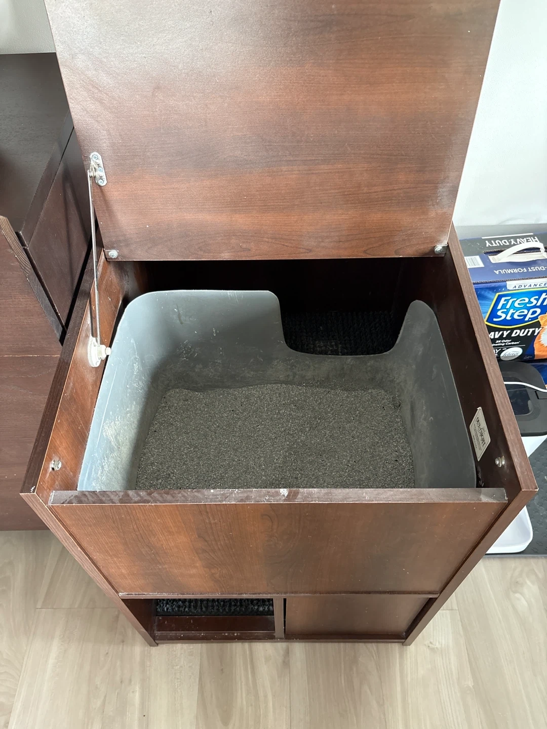 This is a stylish and functional cat litteri box enclosure ! It's a great way to keep the litter box hidden and blend in with your home decor. The enclosure is in great condition and ready for a new home. Will be thoroughly cleaned prior to pick up.