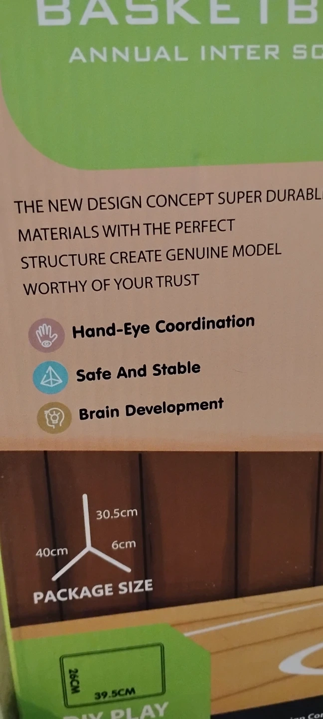 This Rival Basketball DIY Play Master is a fun and engaging toy for kids. The box highlights that it helps with hand-eye coordination, is safe and stable, and promotes brain development. The package size is 40cm x 39.5cm x 26cm.