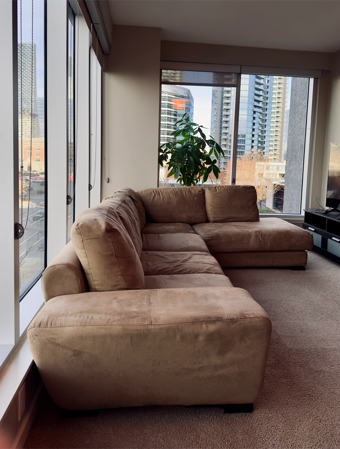 Selling a comfy beige sectional sofa. It's perfect for a living room and relaxing. It has a neutral colour that would fit with any decor. It's in great condition and ready for a new home!