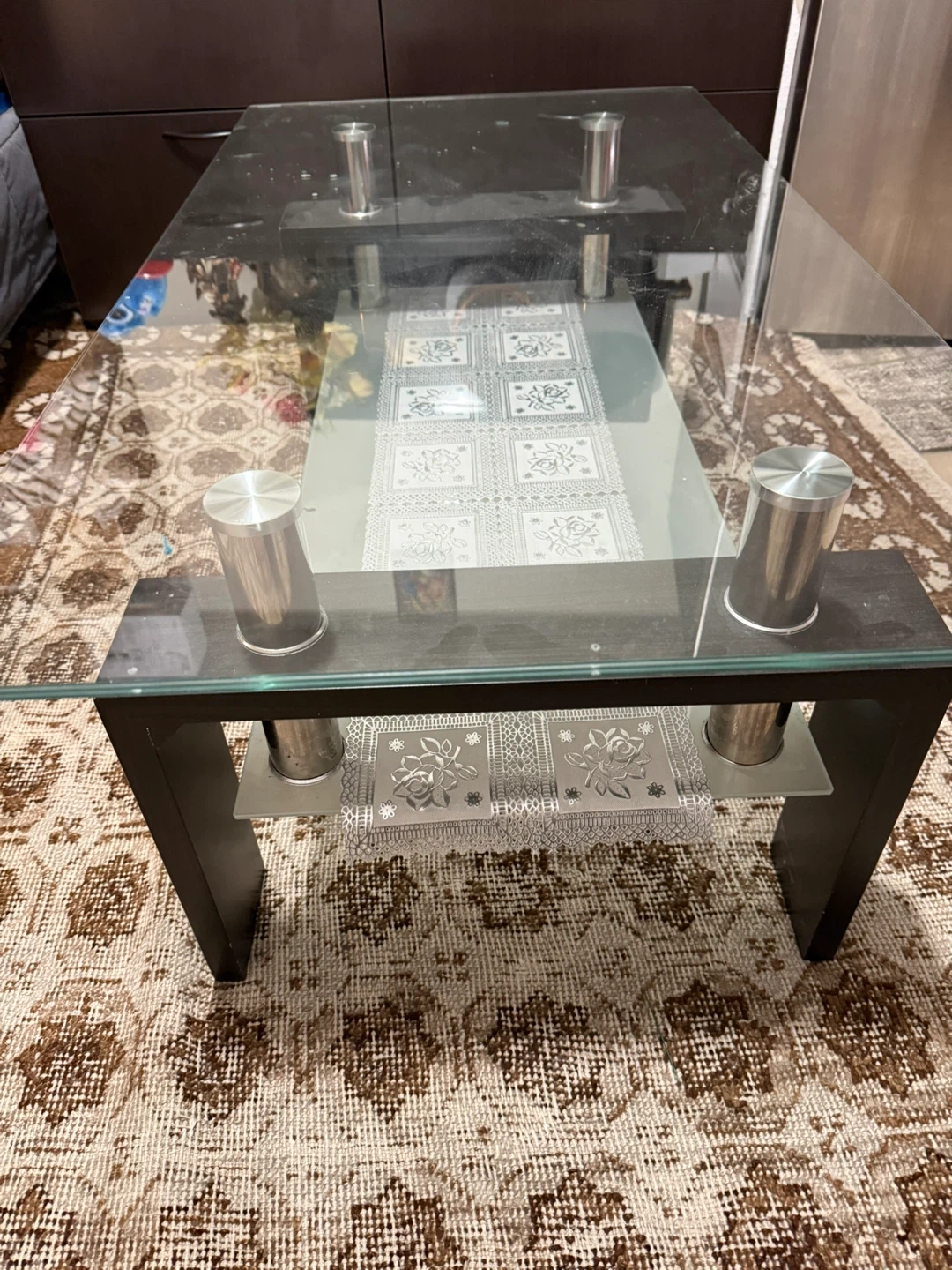 Selling a glass top coffee table with a dark brown frame. It has a modern look with cylindrical metal accents. There's a patterned shelf underneath the glass top for extra storage or decor