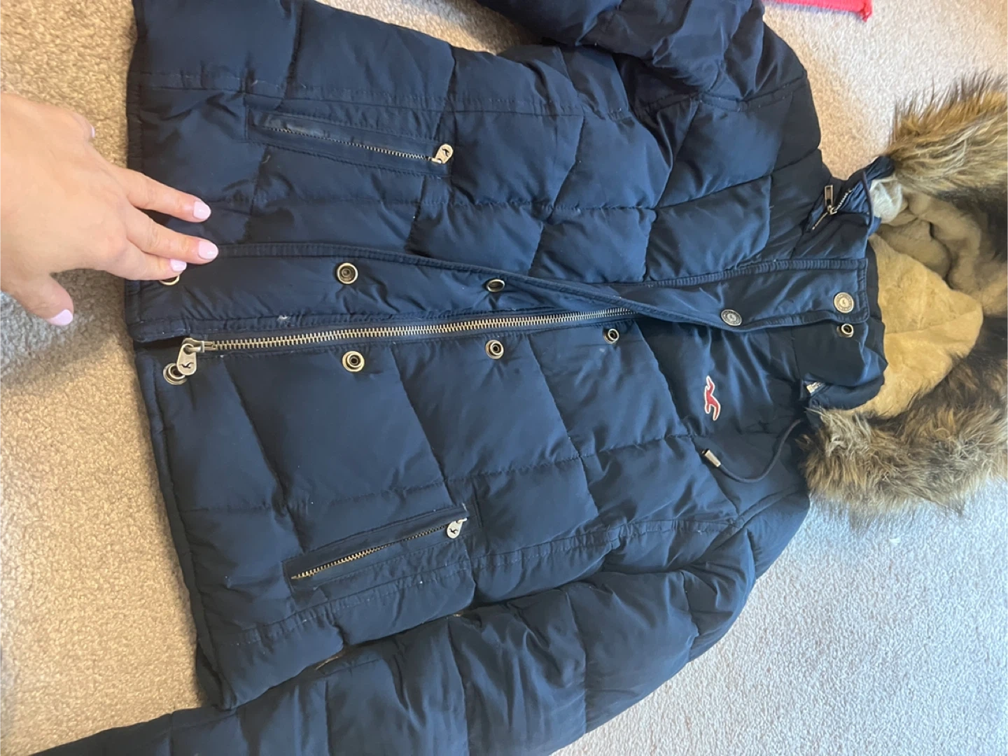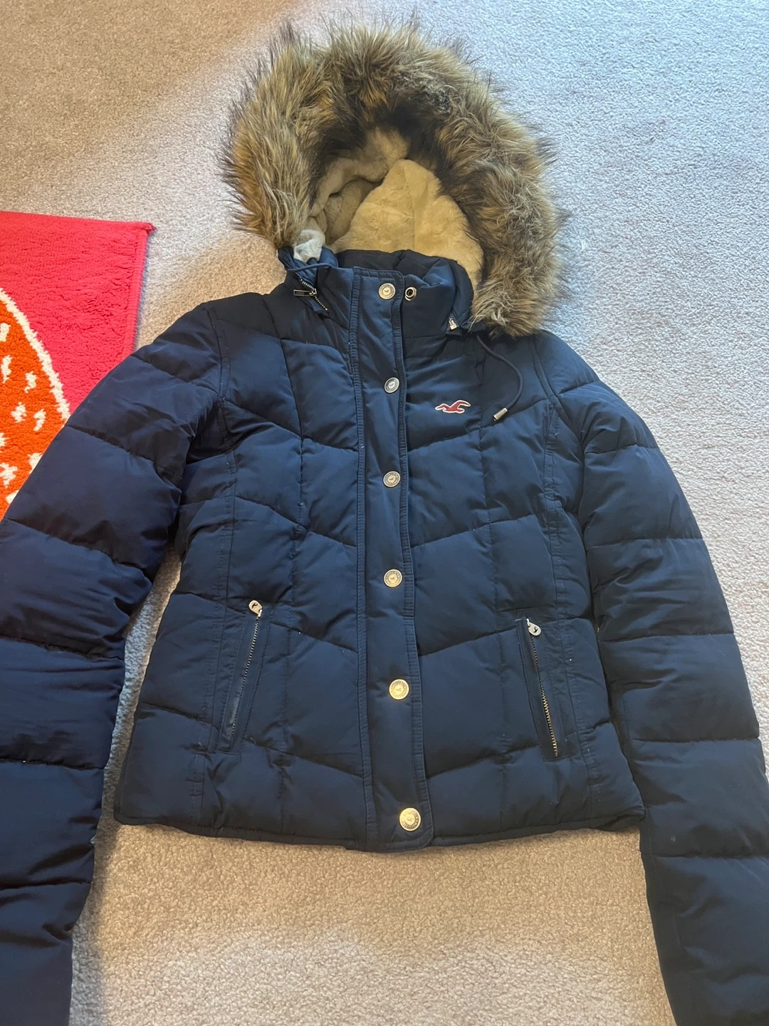 I'm selling a Hollister puffer jacket in size small. It's a navy blue colour with a faux fur hood and a super cozy, soft lining. Perfect for staying warm during the colder months!