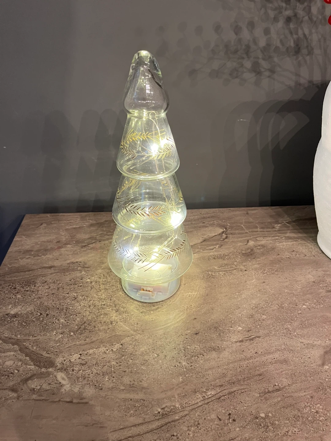 Here's a cute glass Christmas tree with built-in lights! It adds a festive touch to any room. Perfect for the holidays or as a decorative piece year-round