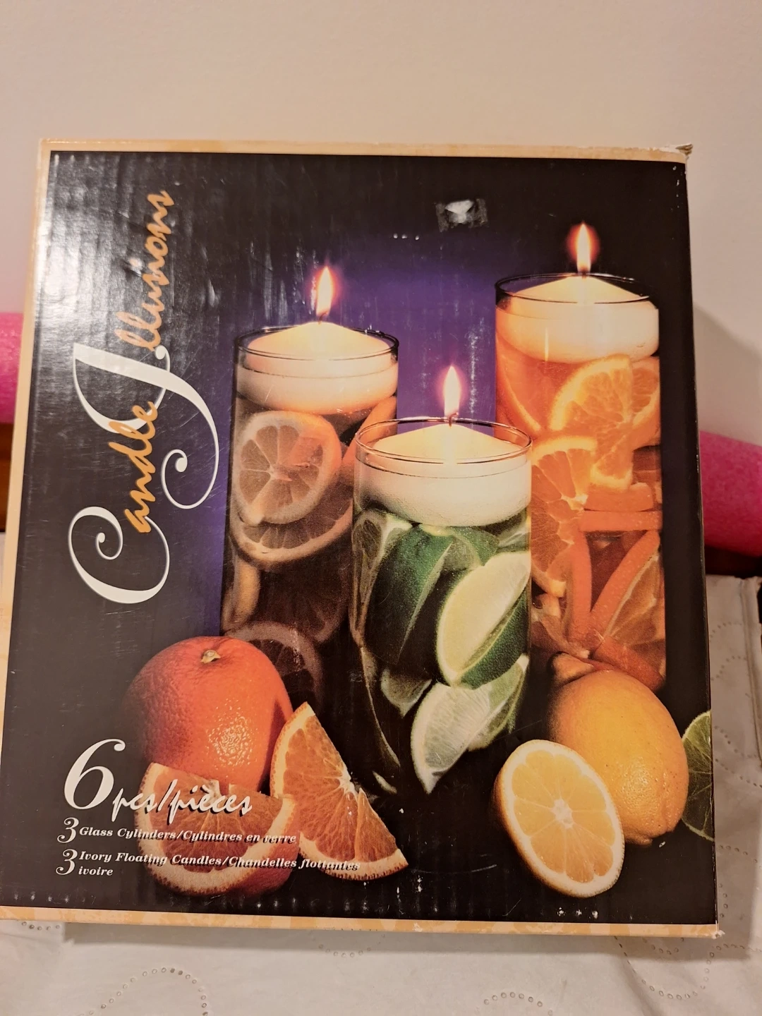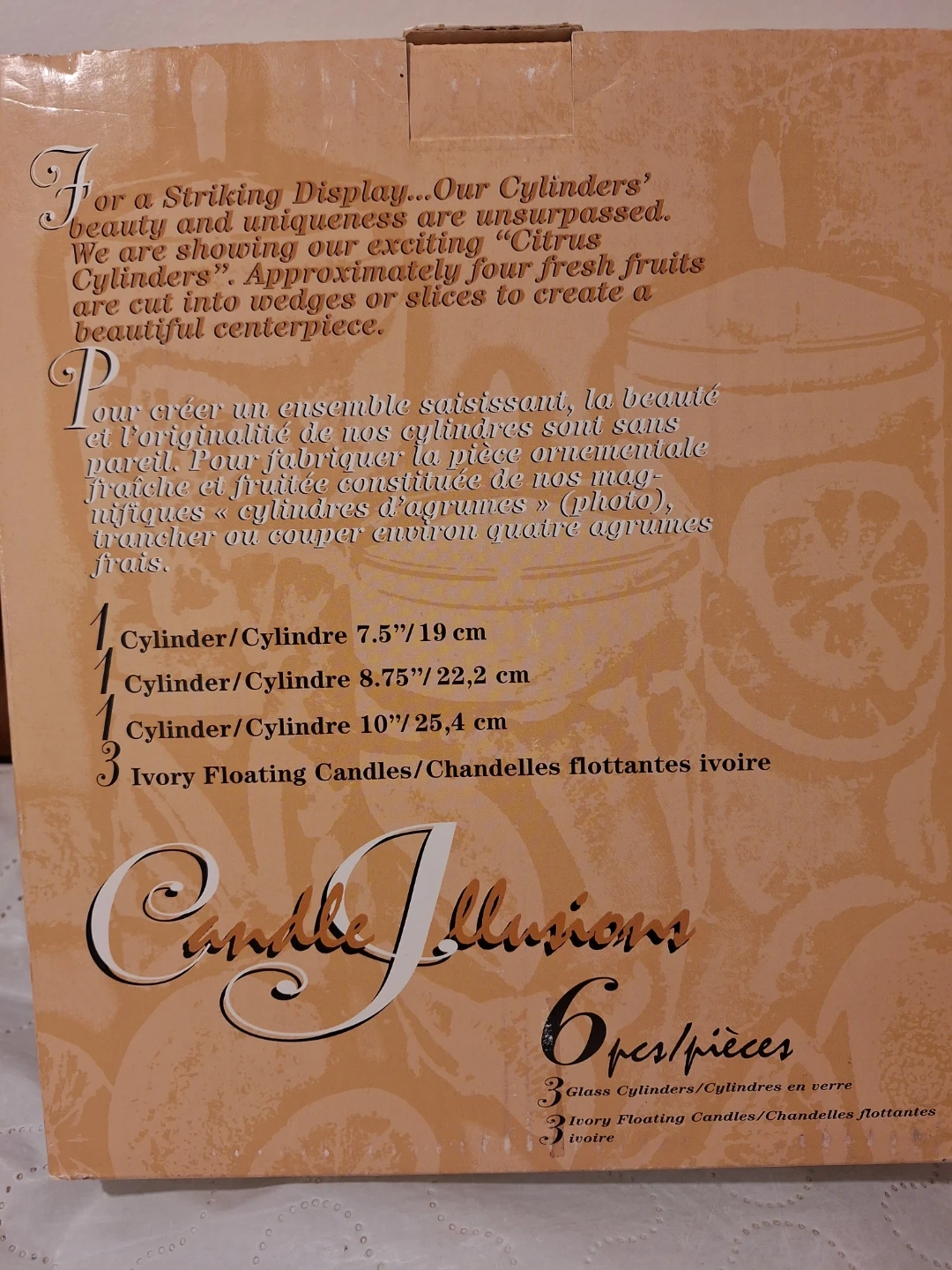 Selling a Candle Illusions cylinder set, complete with 6 pieces. The set includes 3 glass cylinders and 3 ivory floating candles. The cylinders are in varying sizes: 7.5"/19 cm, 8.75"/22.2 cm, and 10"/25.4 cm. Perfect for creating a beautiful centerpiece!