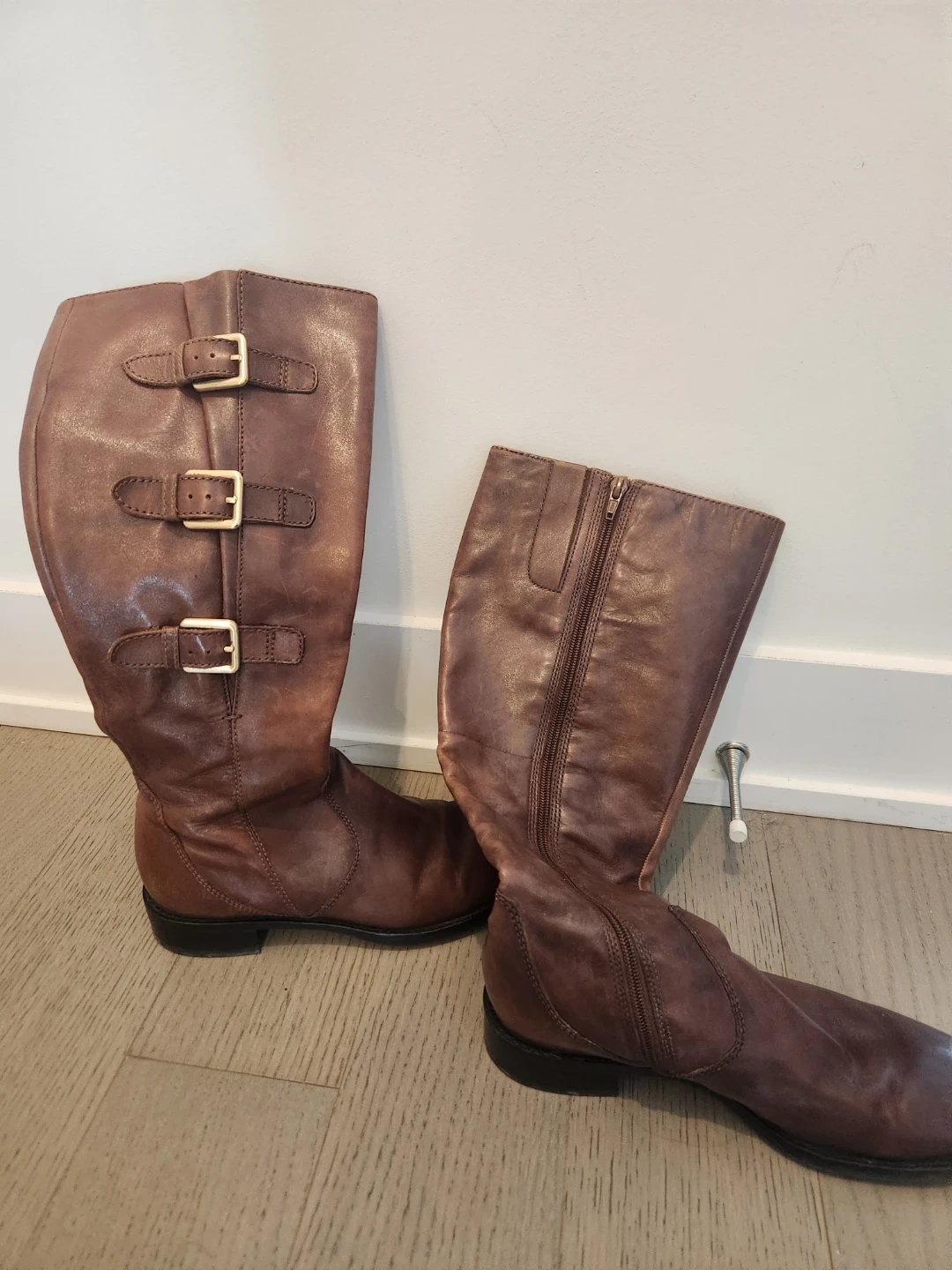 189Selling a pair of well-loved brown leather riding boots. They have a stylish buckle design and a convenient side zipper for easy wear. There are only some minor wear inside. It looks good from outside.