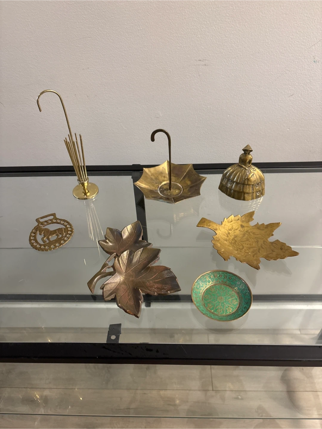 Selling a collection of vintage brass decorative items. They include an umbrella stand, umbrella holder, horse medallion, maple leaf, oak leaf, and a small green dish. Perfect for adding a touch of vintage charm to your home!
