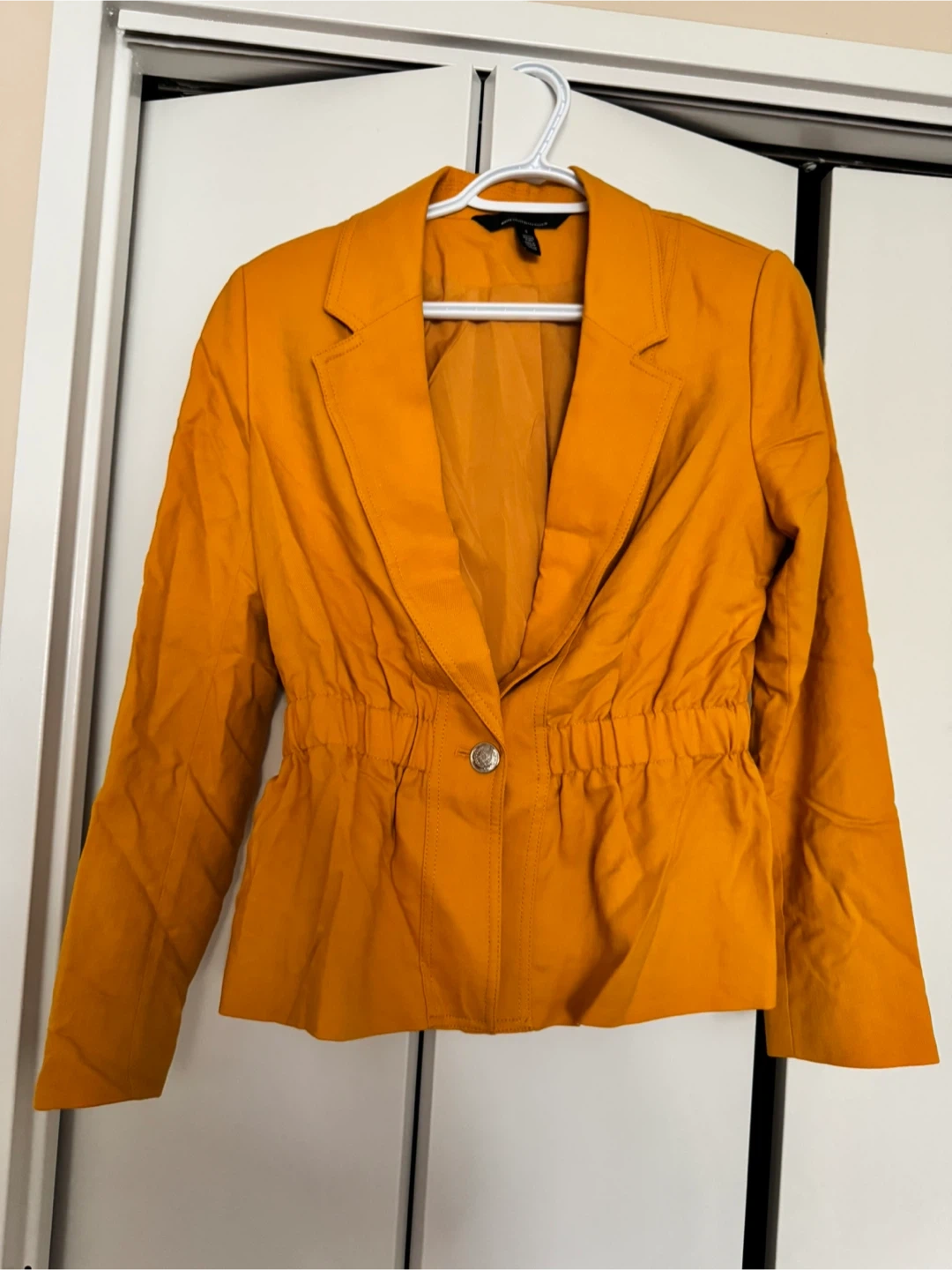 Selling a White House Black Market blazer in a vibrant yellow colour! It's a size 4 and in great condition. The blazer features a stylish design with unique button details on the sleeves. Perfect for adding a pop of colour to your wardrobe!