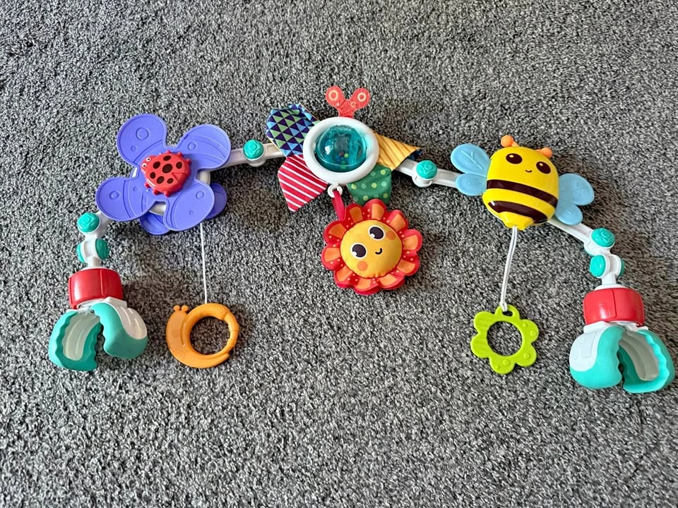 5Includes a big box of amazing rattles that even a toddler would love, v tech talking elephant (needs new batteries), v tech tummy time giraffe pillow, battery operated car steering, car seat hanging toys, battery operated toy phone, rings stacker. All of these toys as can be seen in pictures are really clean, sanitized and hardly used. Pet and smoke free household.