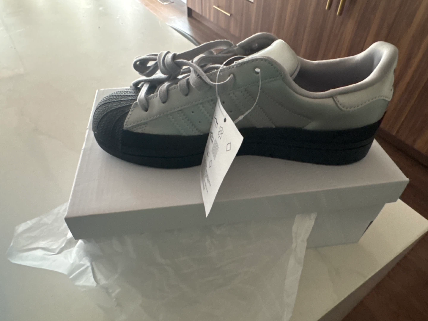Here are some Adidas Superstar shoes in grey! They are in great condition and come with the original box. Perfect for everyday wear or adding to your sneaker collection