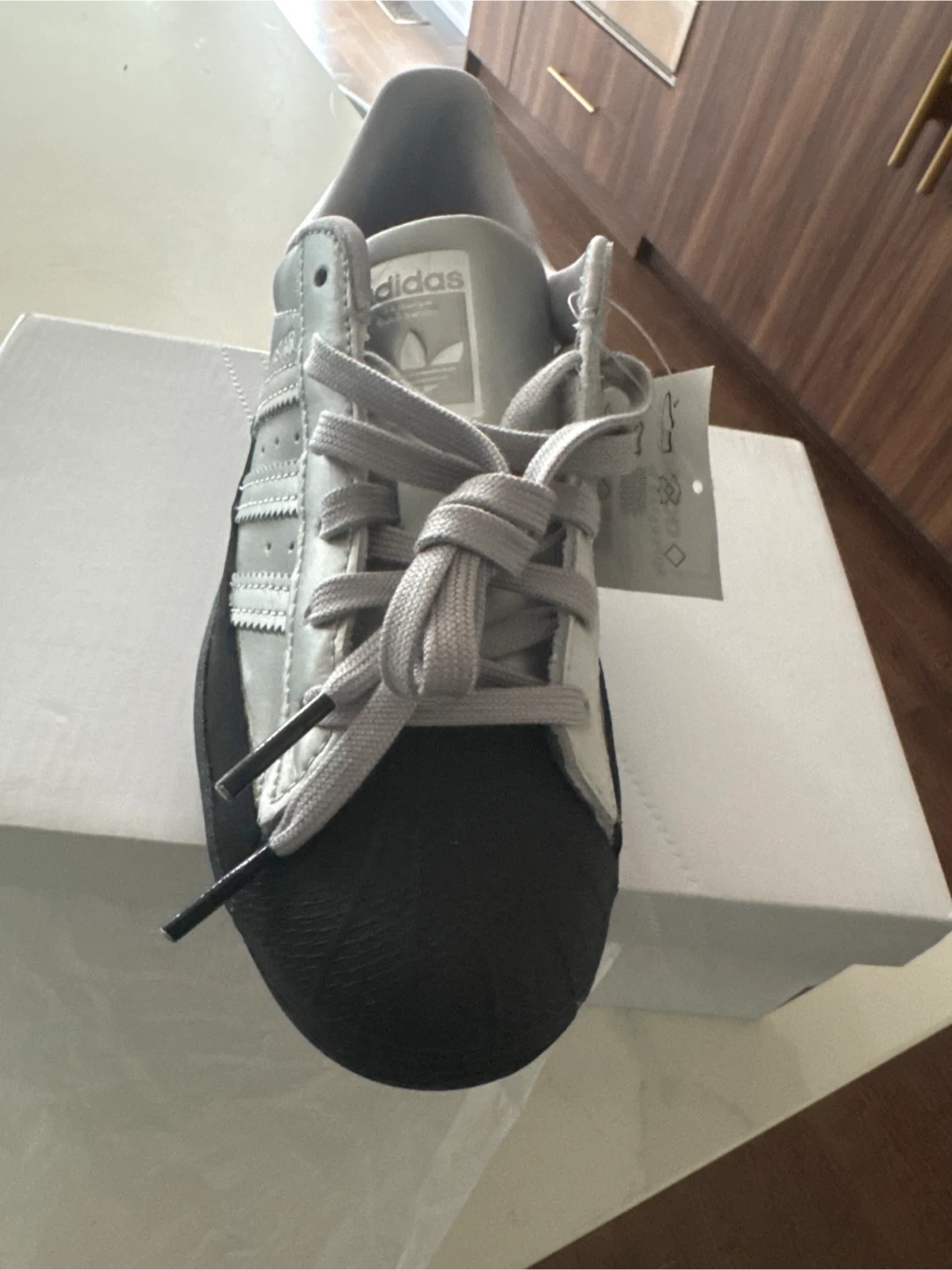 Here are some Adidas Superstar shoes in grey! They are in great condition and come with the original box. Perfect for everyday wear or adding to your sneaker collection