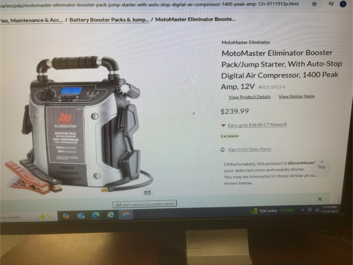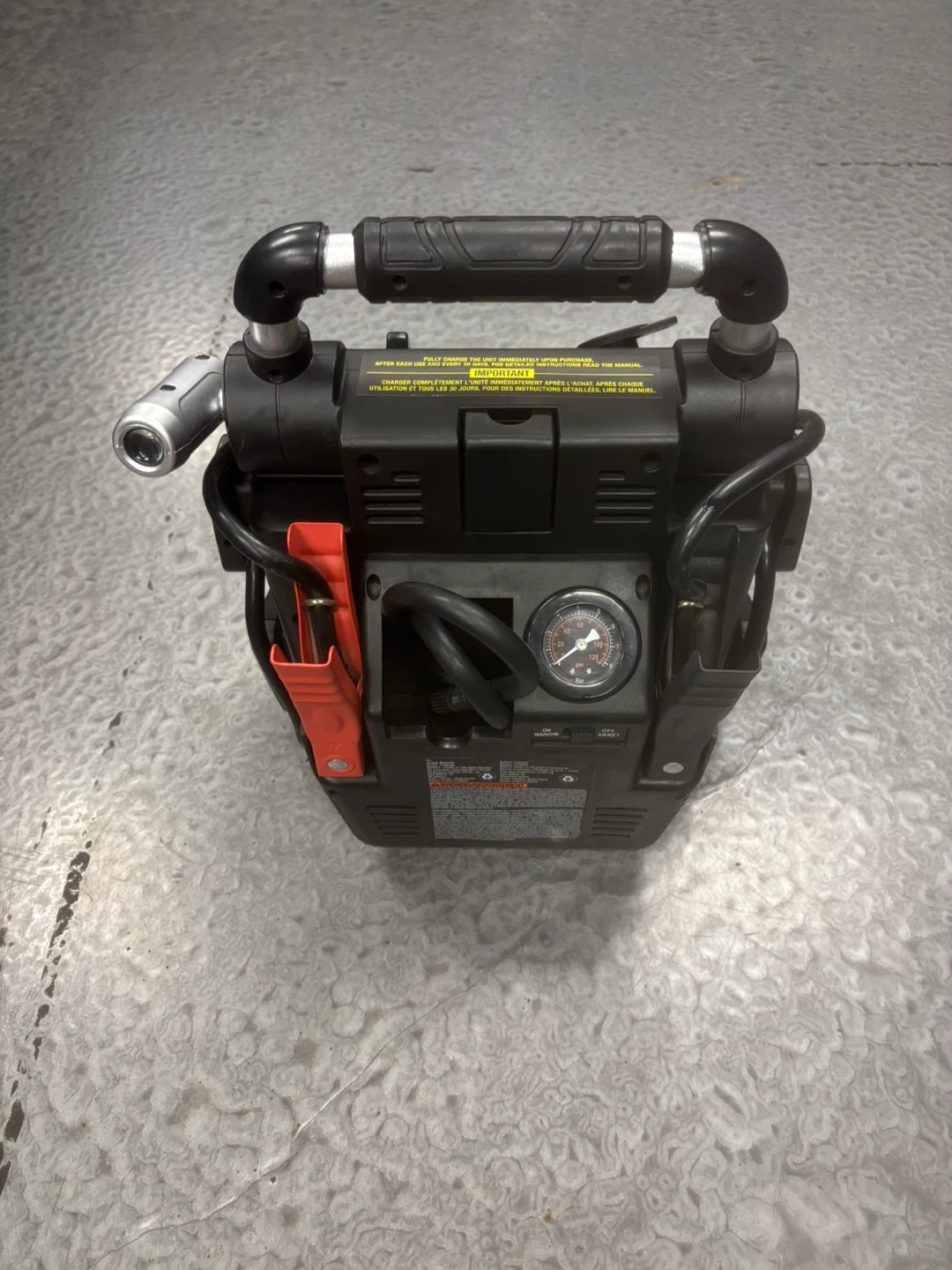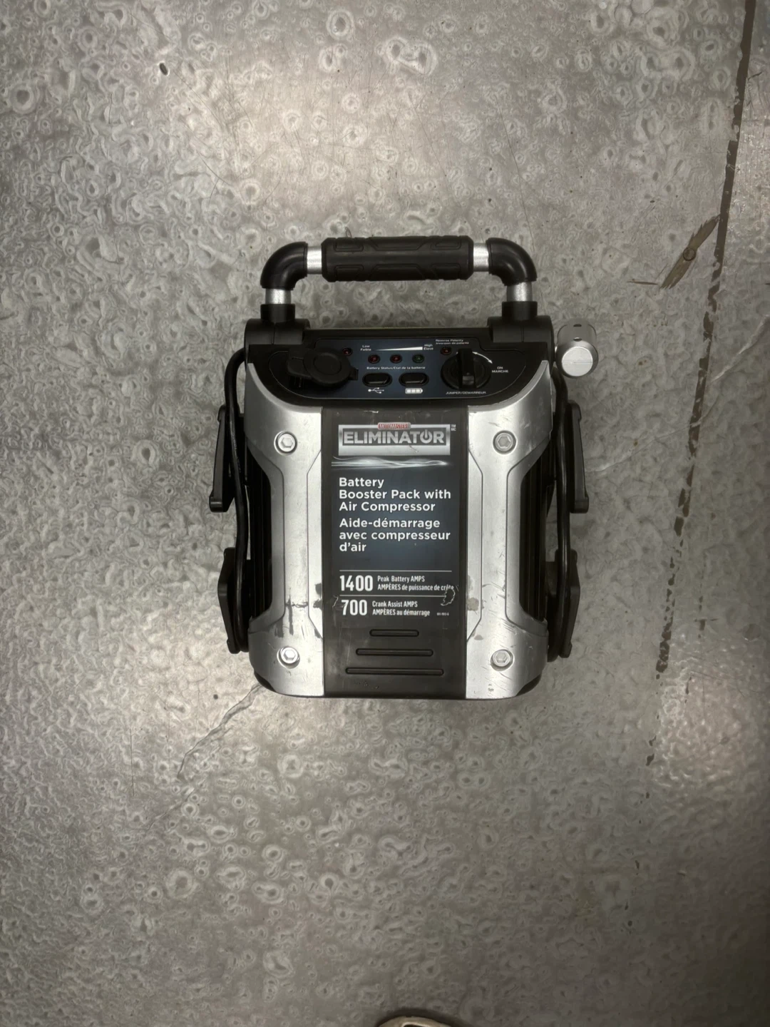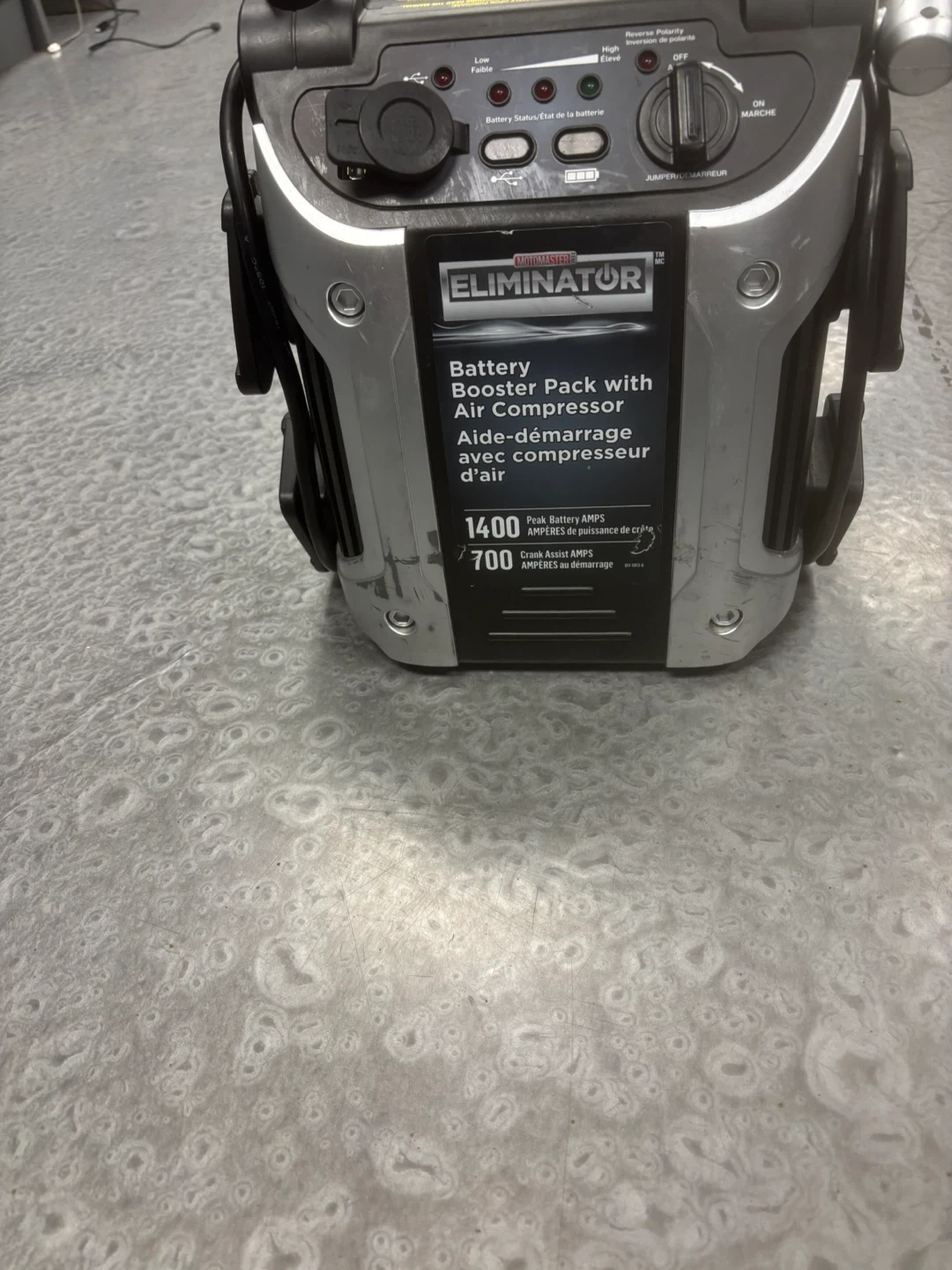 Selling a MotoMaster Eliminator Booster Pack/Jump Starter with Air Compressor. Originally bought for $239.99. It has a silver, black, and red design. Great for boosting your car or inflating tires!