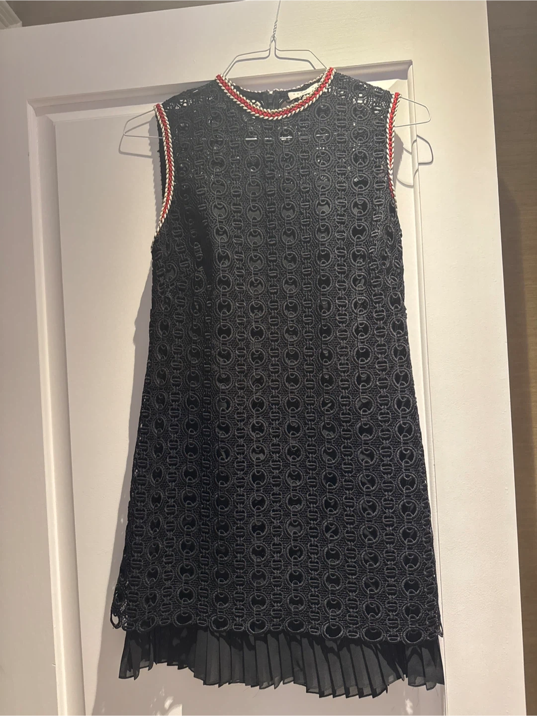 This is a lovely Sandro black lace sleeveless dress. It's in great condition and ready for a new home! The dress features a beautiful lace pattern and a pleated hem. Perfect for a special occasion or a night out