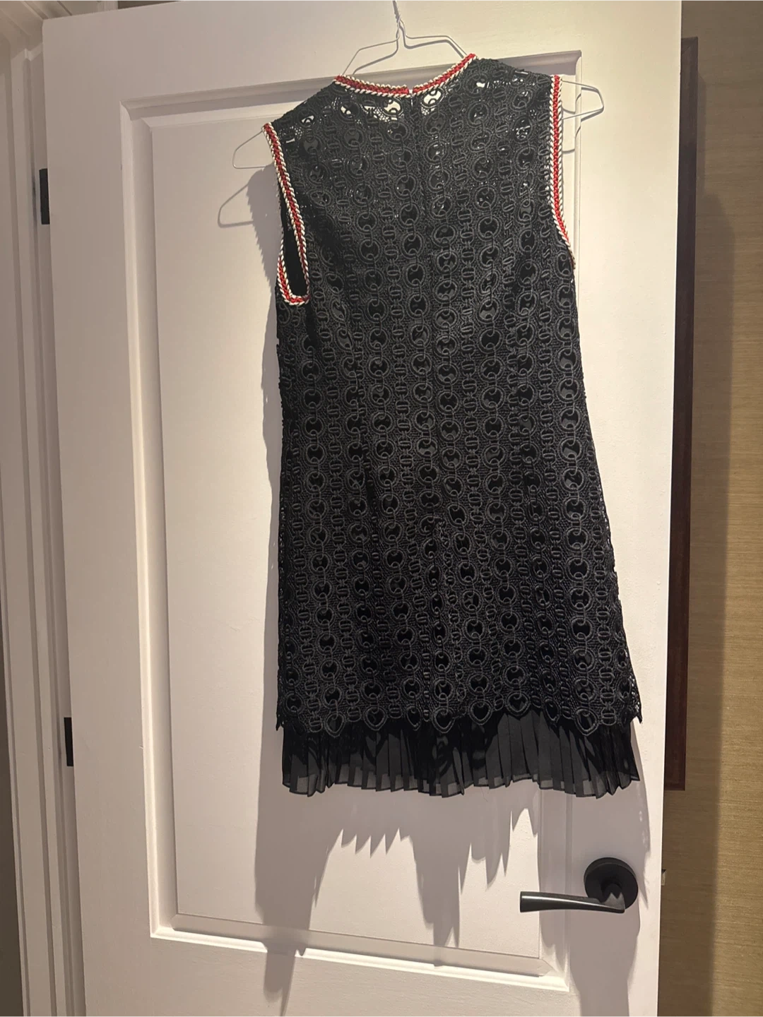 This is a lovely Sandro black lace sleeveless dress. It's in great condition and ready for a new home! The dress features a beautiful lace pattern and a pleated hem. Perfect for a special occasion or a night out
