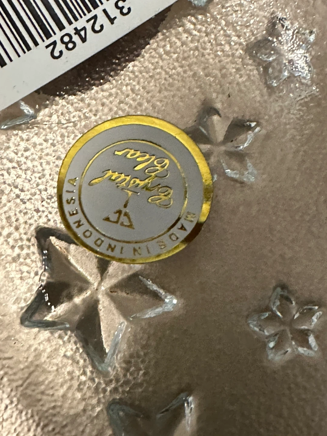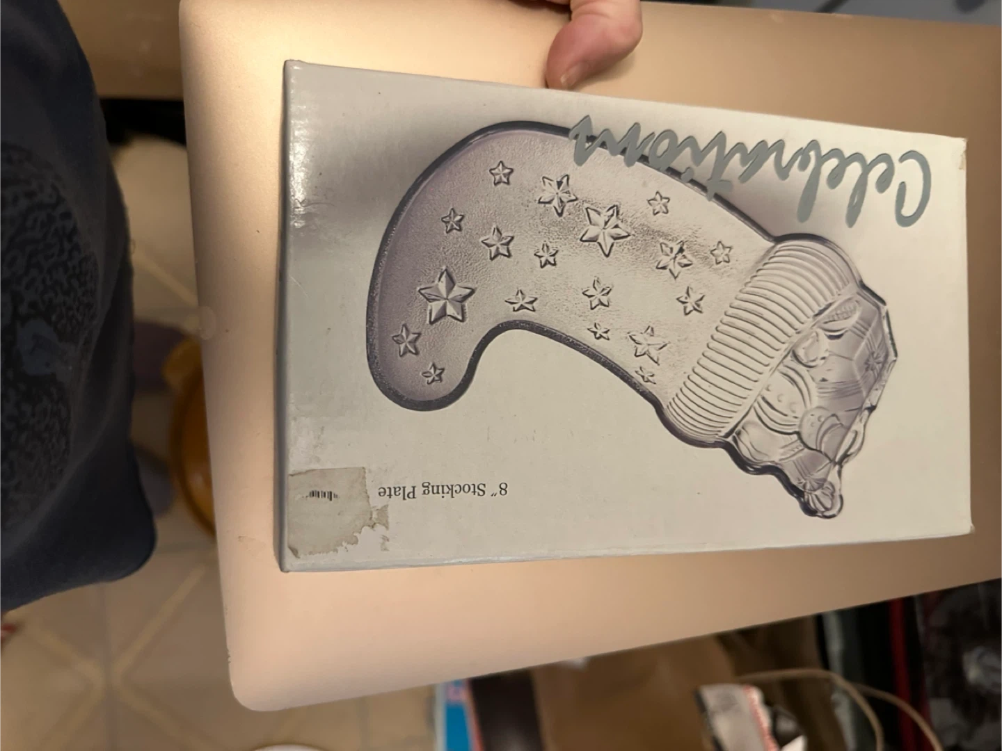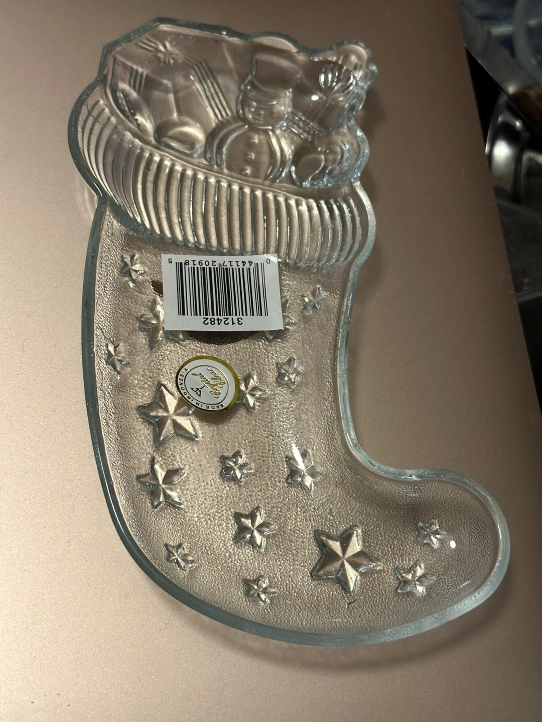 Selling a brand new Crystal Clear 8" Stocking Plate! It comes in its original box and is perfect for holiday treats or decorations. The plate features a cute stocking shape with star details. It's a lovely addition to any festive setting!