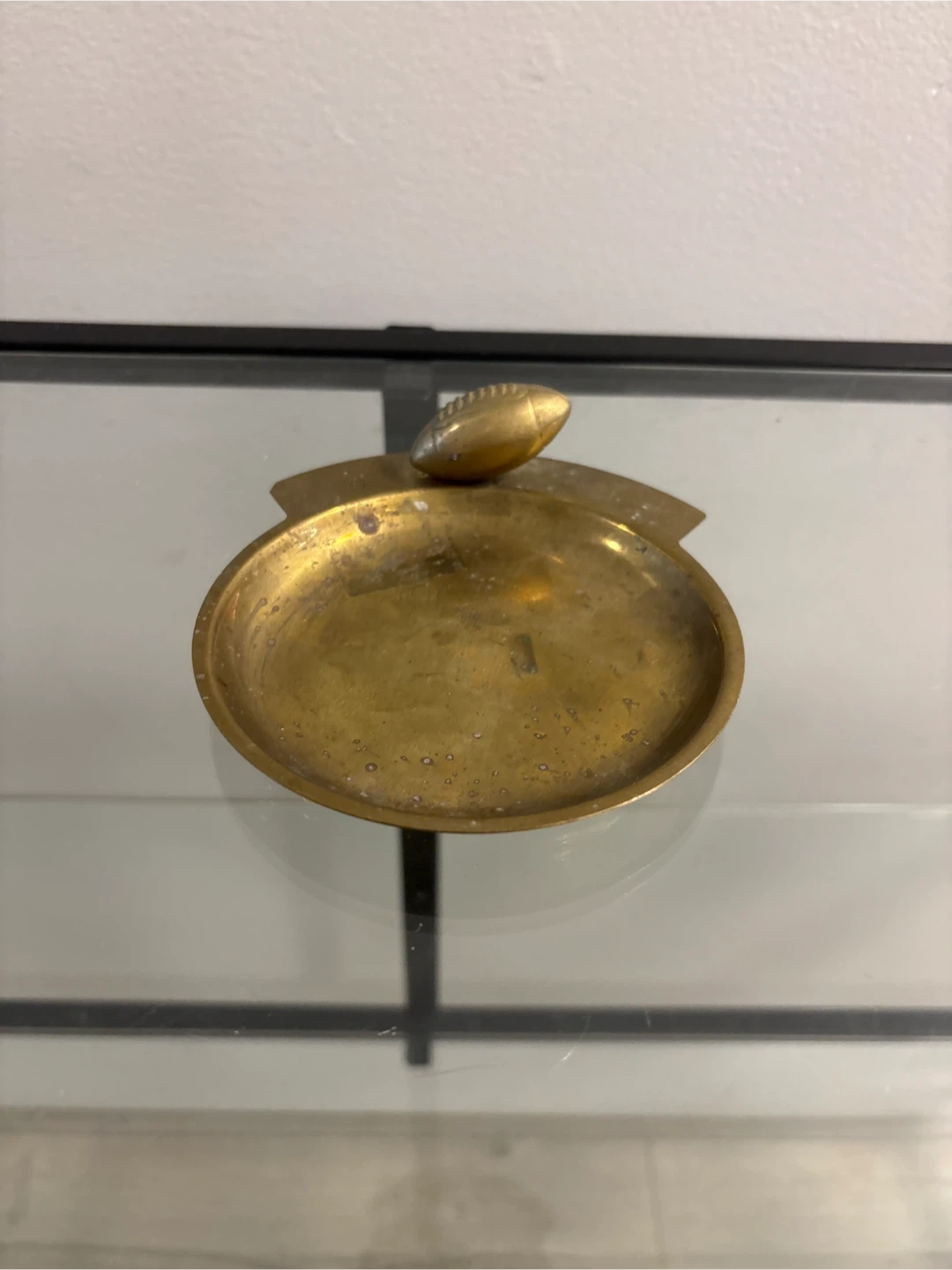 Here's a neat vintage brass trinket dish! It features a football design on top. It would be perfect for holding small items or as a decorative piece