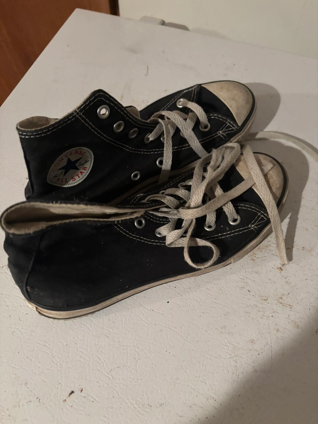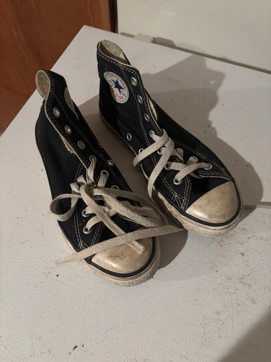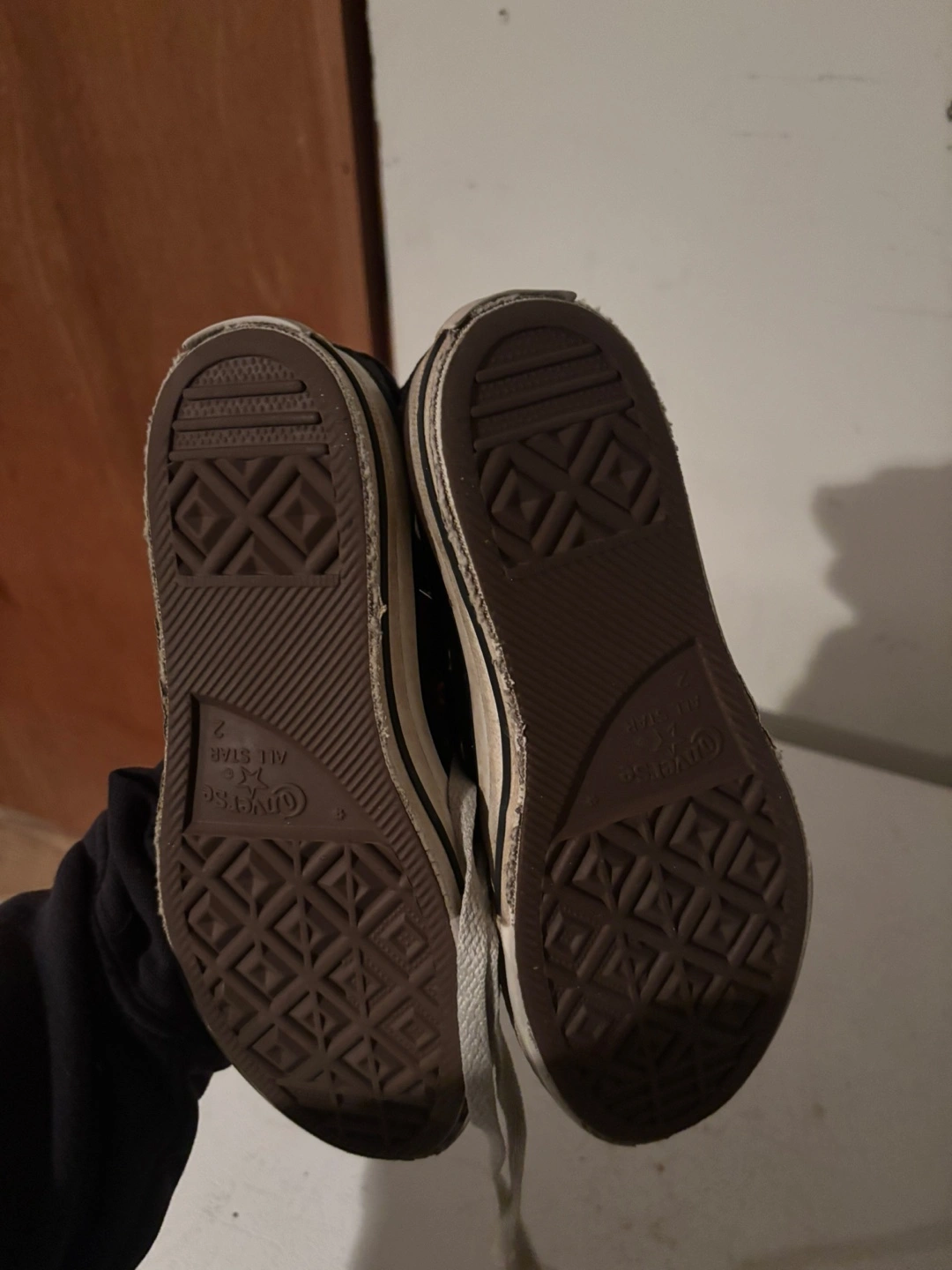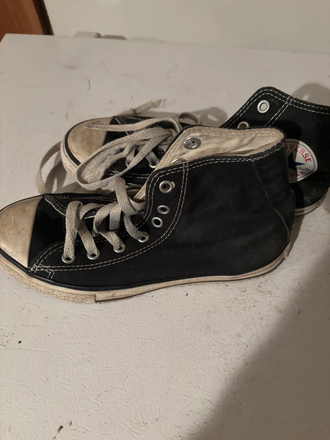 Selling a pair of Converse All Star high tops in youth size 2. They're black and have some wear, as you can see in the photos. Still lots of life left in them!