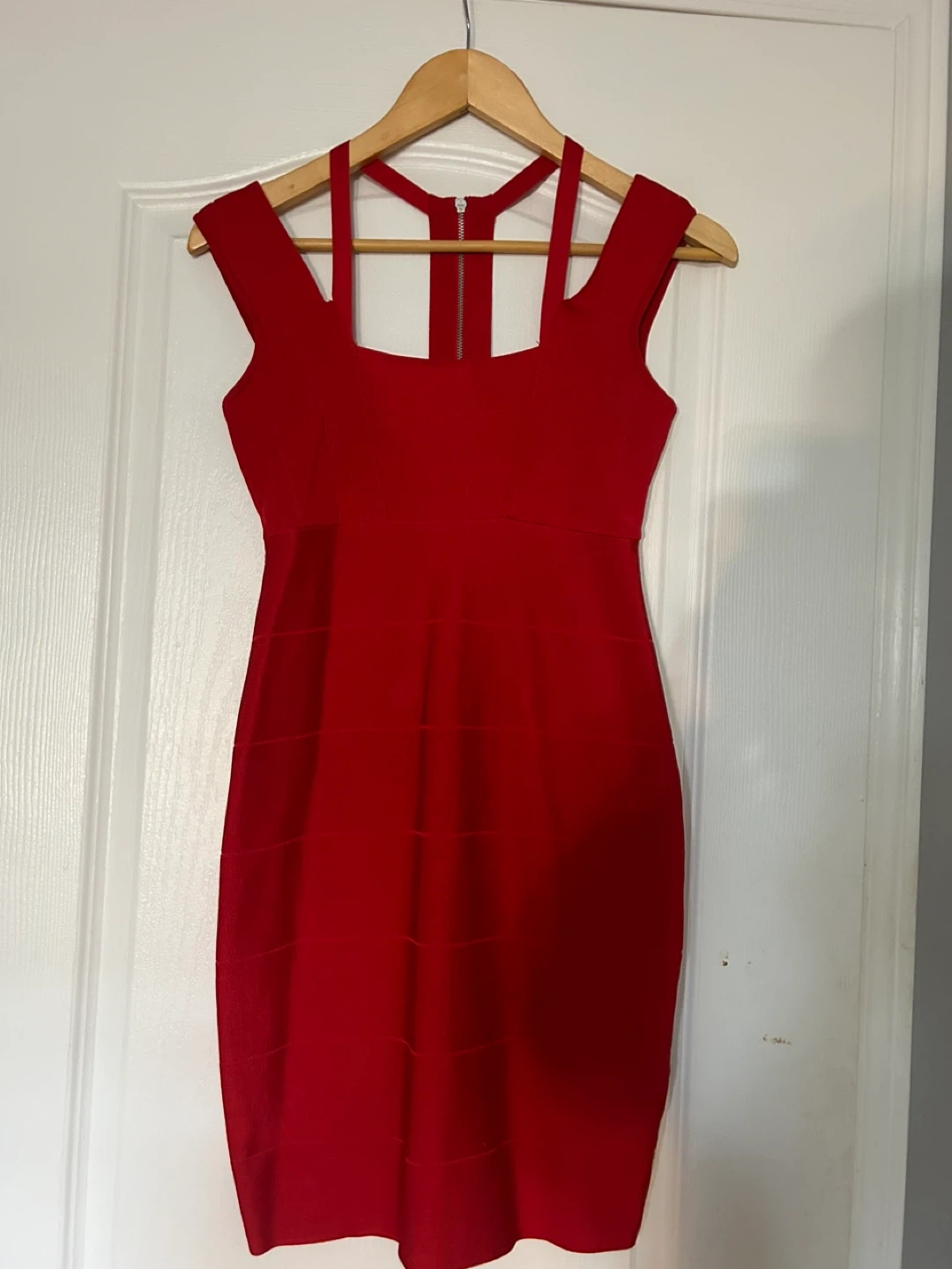 Selling a beautiful red dress from Armani Exchange! It's a size small and in great condition. Perfect for a night out or a special occasion. The dress features a unique strap design and a sleek, bodycon fit. Feel free to message me with any questions!