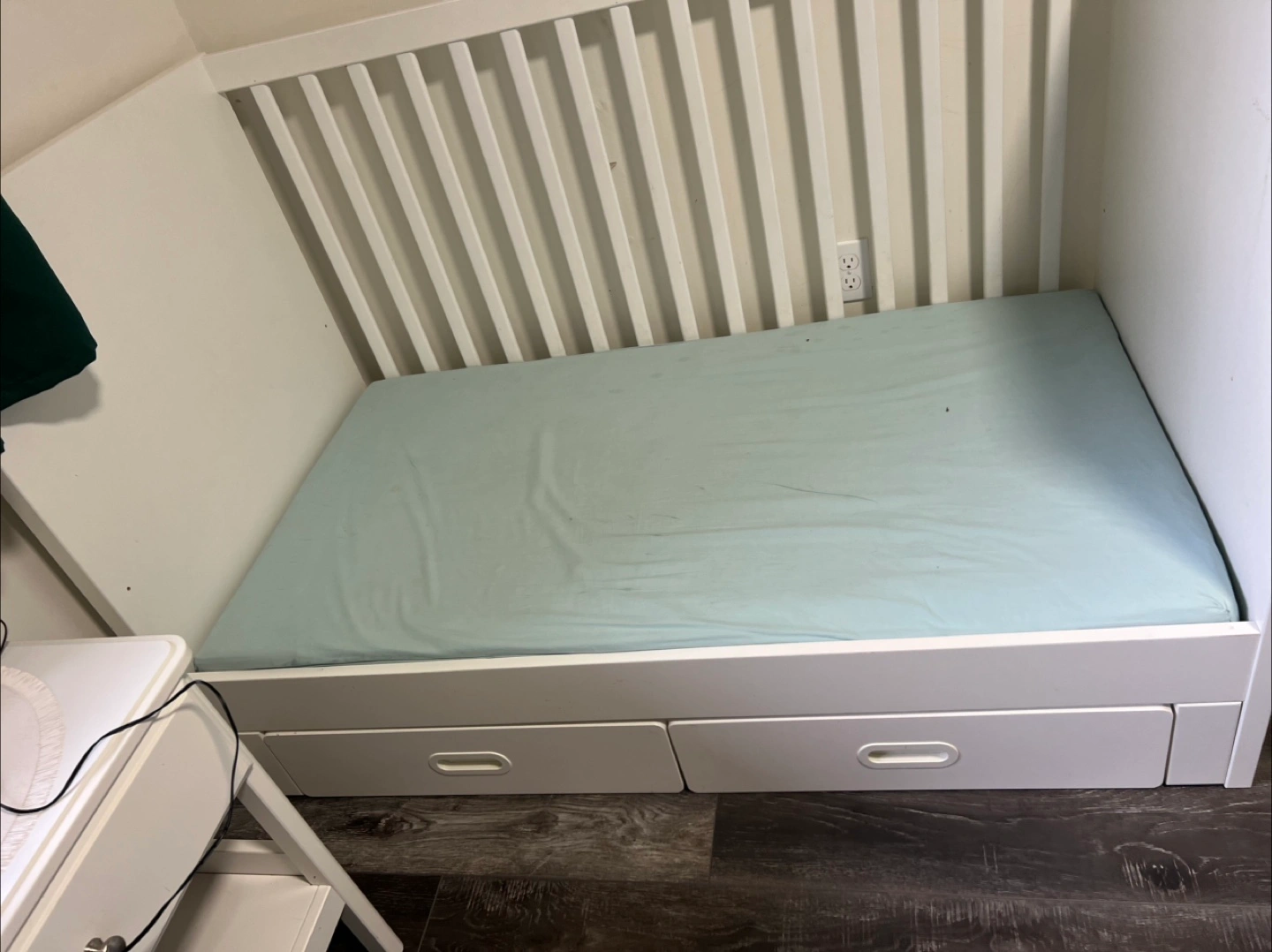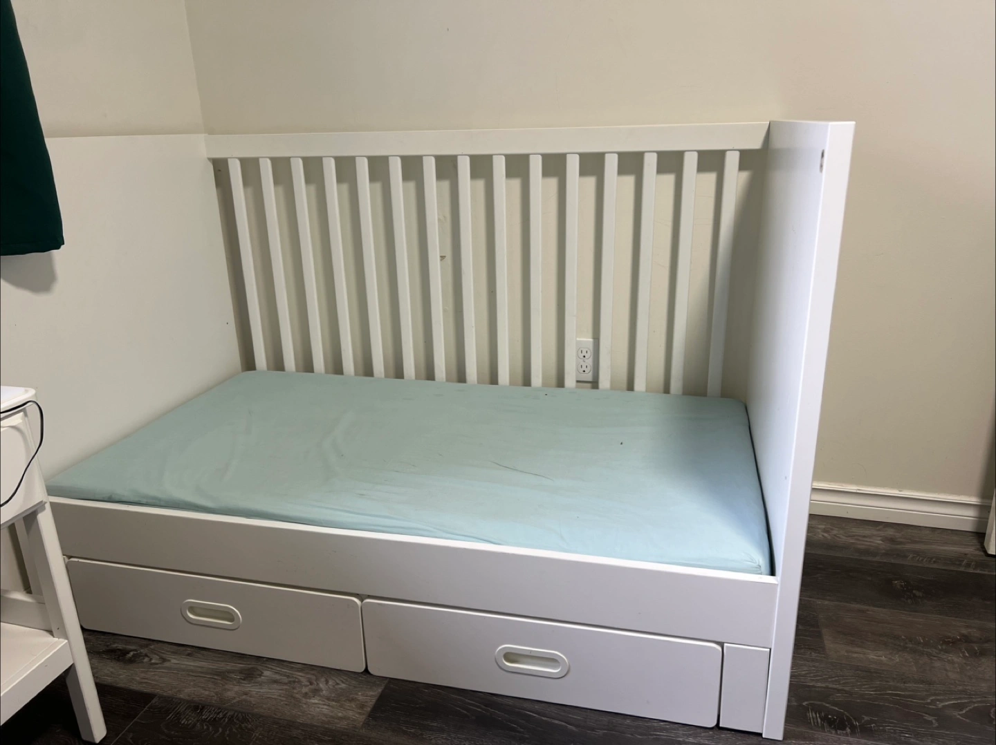 Selling a gently used IKEA Sundvik crib in great condition. It's a sturdy and reliable crib that has served us well. The crib features a classic design and is perfect for any nursery. It also has convenient drawers underneath for extra storage
