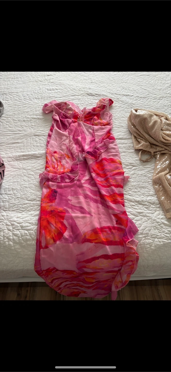 Selling a PrettyLittleThing pink floral asymmetric maxi dress in size 8. It's in great condition and has a beautiful floral pattern!