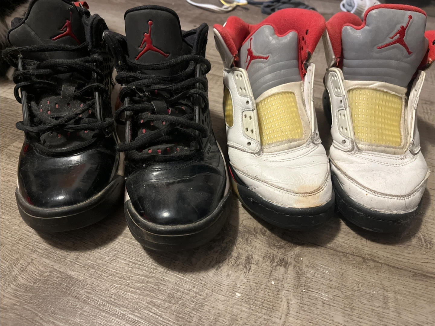 Selling a pair of well-loved Jordan sneakers. One pair is black, and the other pair is white with red accents. They show signs of wear, as pictured.