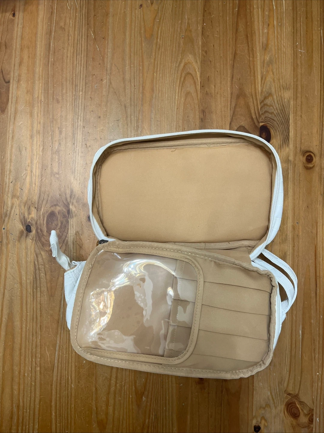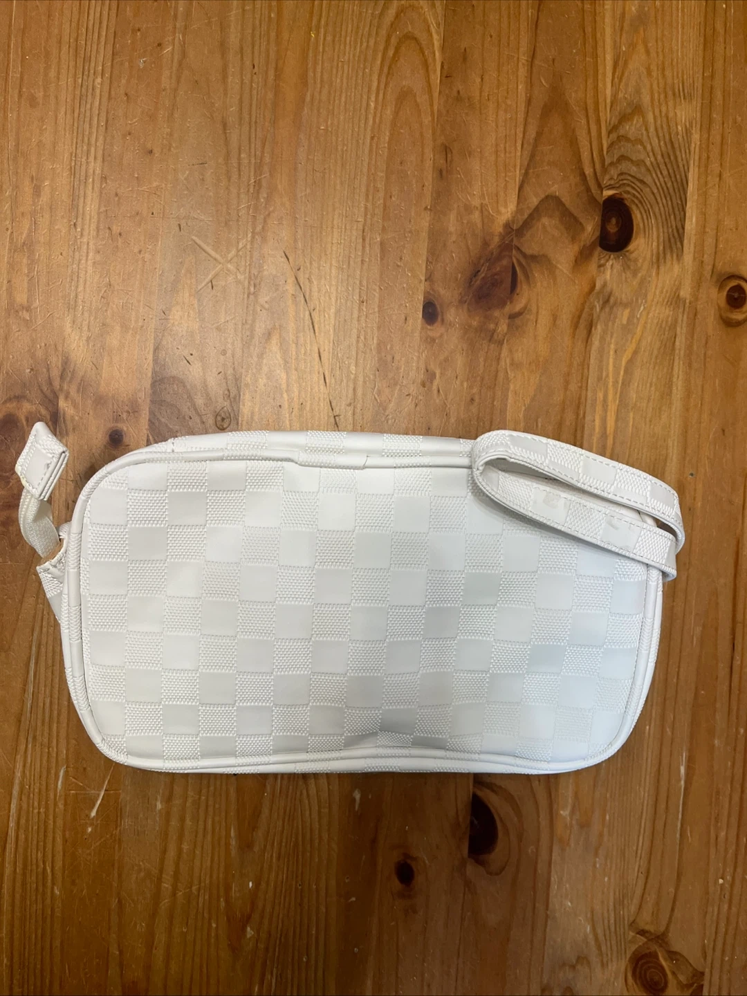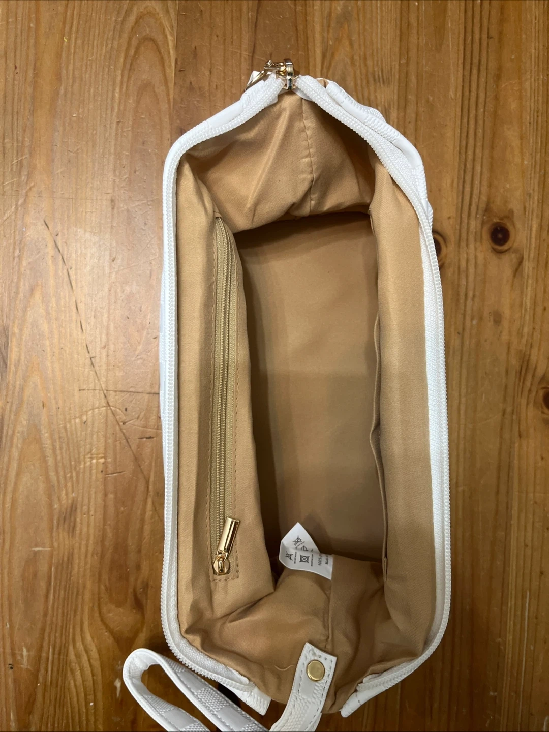 15Here's a cute white cosmetic bag with a checkered pattern! It has a zipper closure and a handle for easy carrying. The interior is lined with a tan fabric and features a zippered pocket.