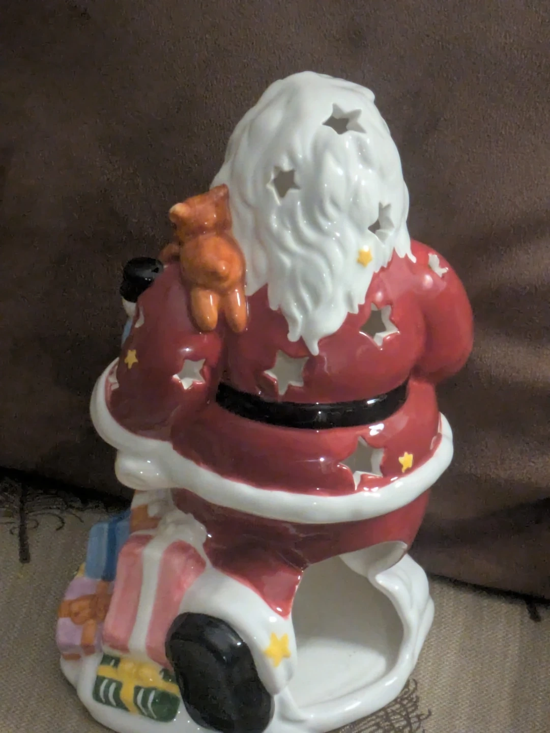 This is a charming ceramic Santa candle holder! It's in great condition and would be perfect for adding a festive touch to your home during the holidays