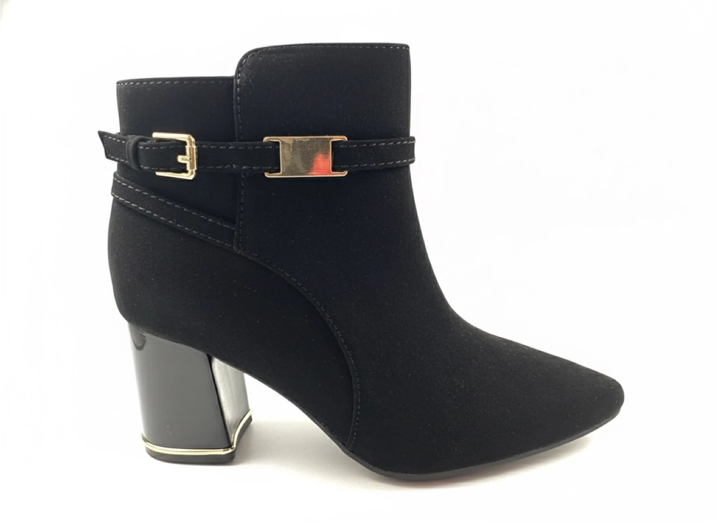 These are a stylish pair of black ankle booties. They feature a block heel and a decorative gold buckle detail. Perfect for adding a touch of elegance to any outfit!