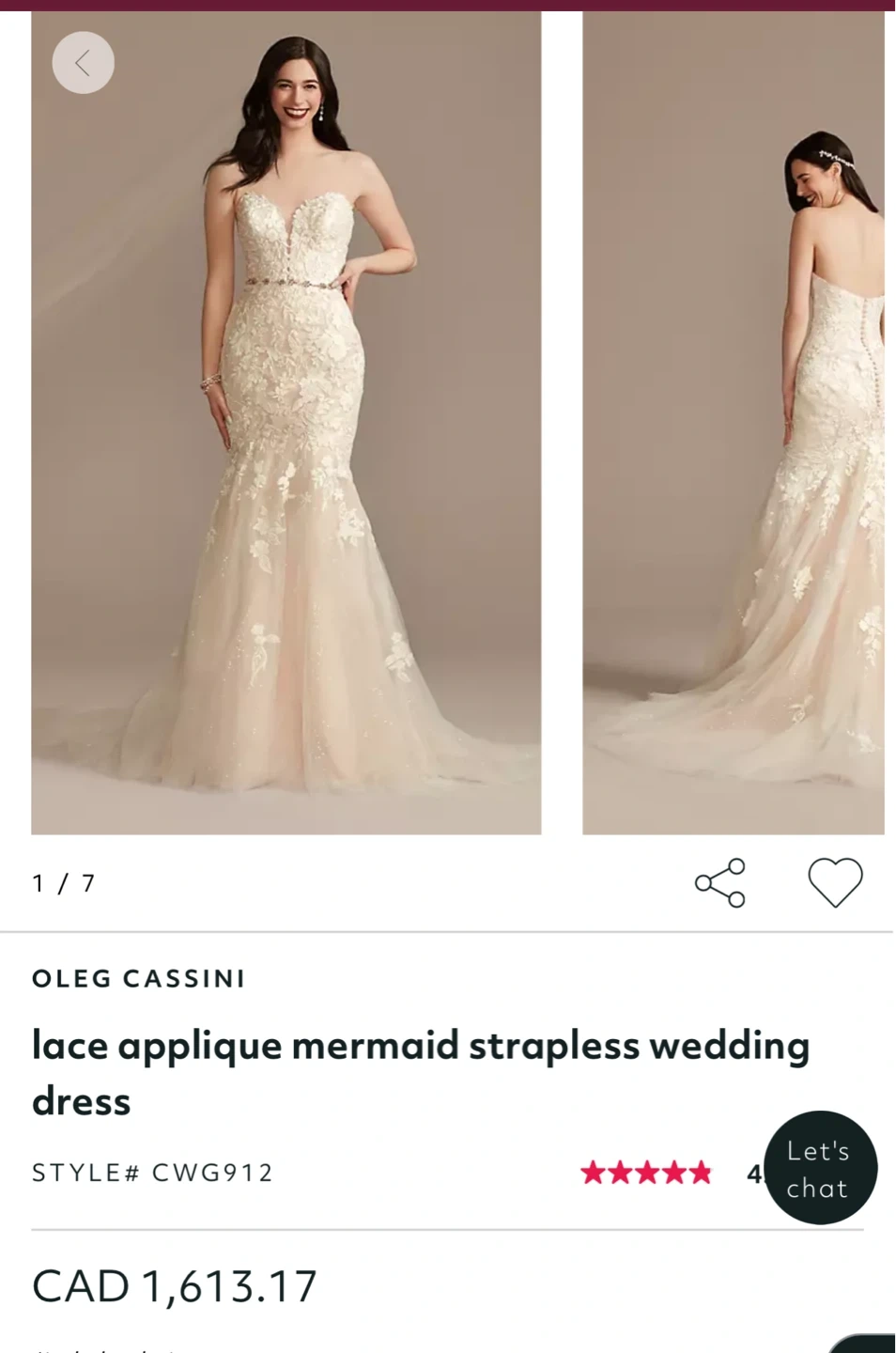 Selling a beautiful Oleg Cassini lace applique mermaid strapless wedding dress, style CWG912. It's a stunning dress that would be perfect for your special day! Originally listed for CAD 1,613.17.