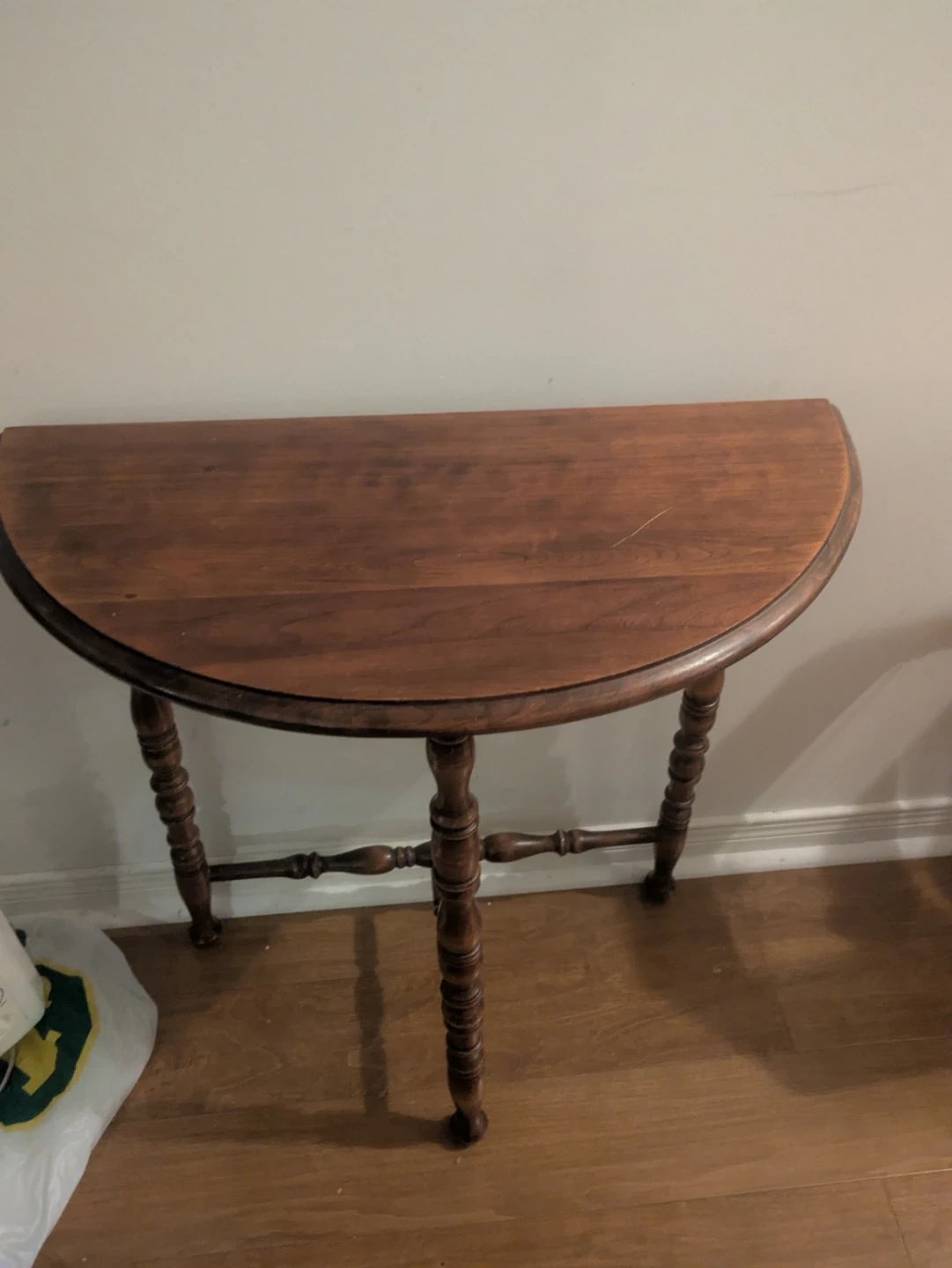 Selling a cute, solid wood half-moon accent table. It's in good condition and would look great in an entryway or small space