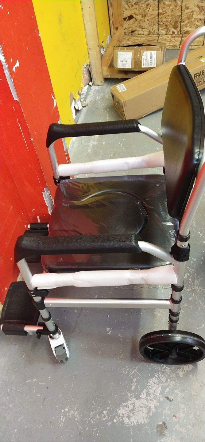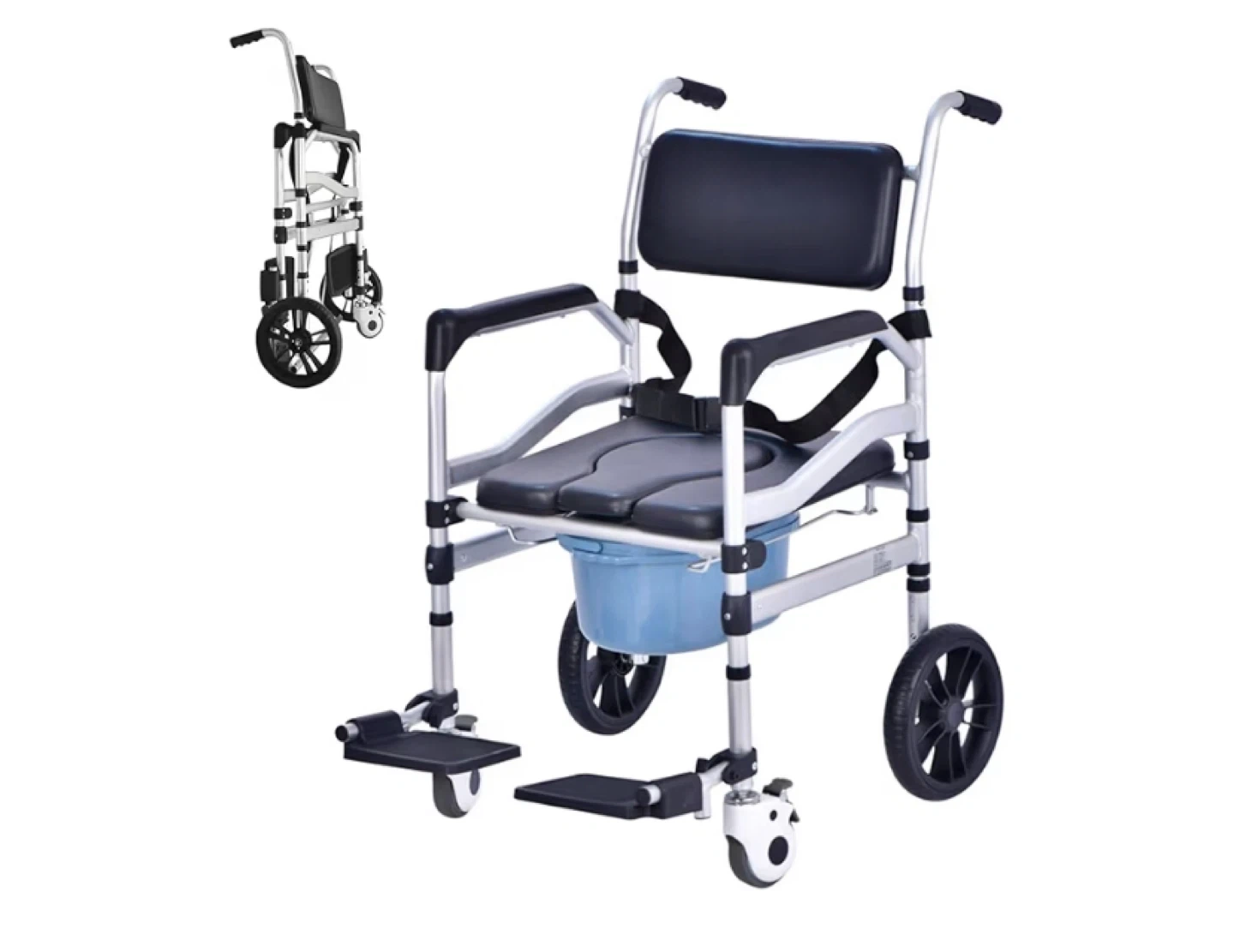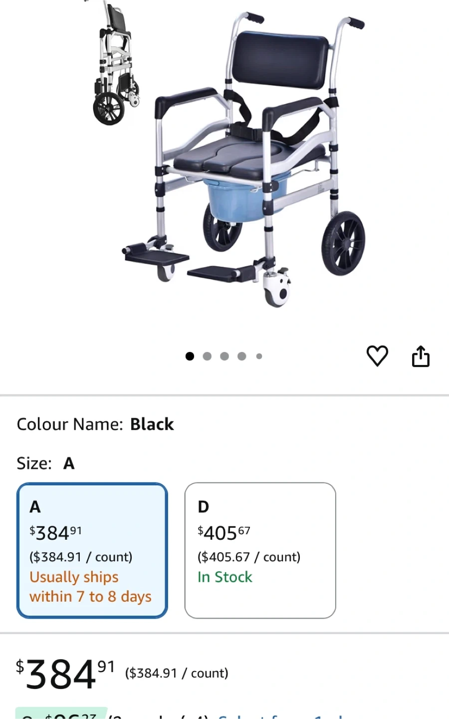Selling a portable commode wheelchair in black, size A. It features adjustable height in three gears and an automatic snap for easy operation. It's designed to meet the needs of different people. Originally bought for $384.91.