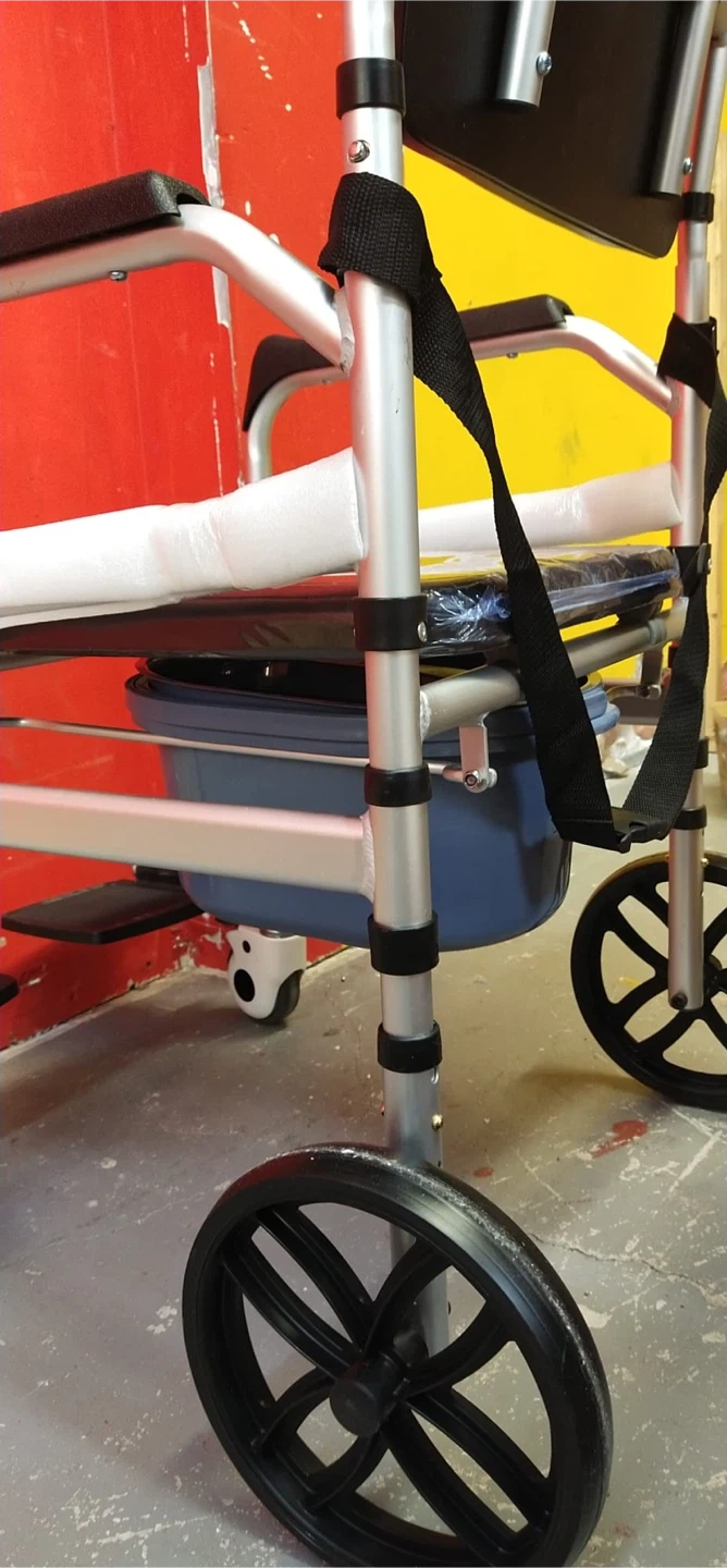 Selling a portable commode wheelchair in black, size A. It features adjustable height in three gears and an automatic snap for easy operation. It's designed to meet the needs of different people. Originally bought for $384.91.
