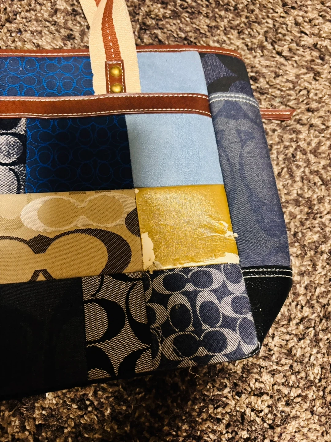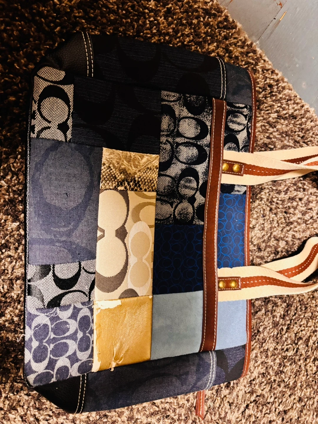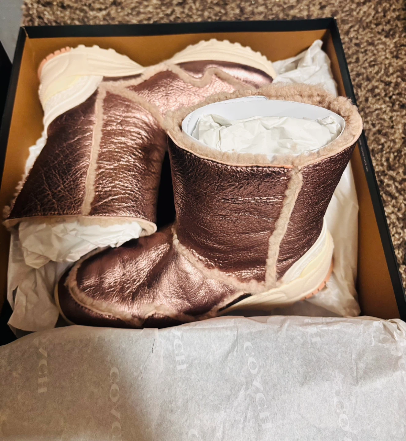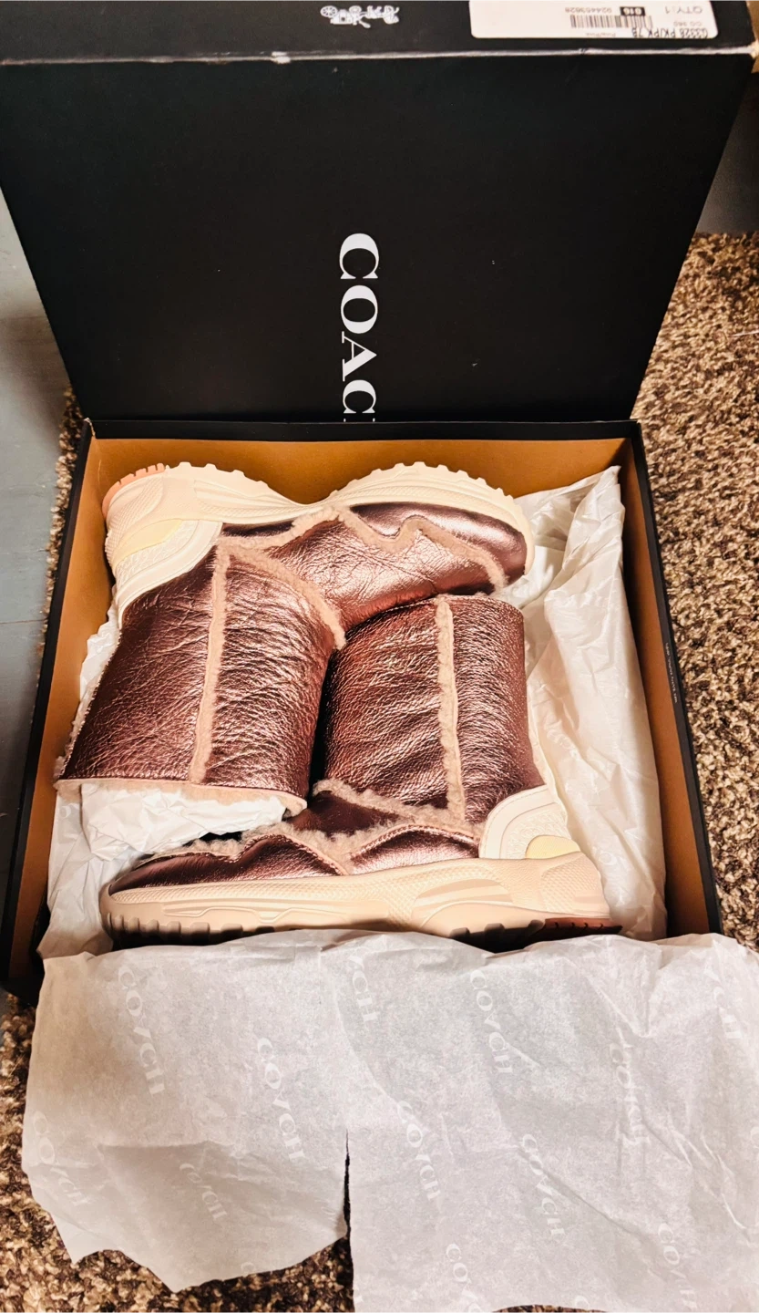 Selling a Coach Signature bag along with a pair of metallic boots! Both come with their original box. The bag has the classic Coach signature pattern, and the boots have a unique metallic finish. Perfect for adding a touch of style to your wardrobe. Coach bag tan is 40, blue coach bag is 30, and Coach boots are 100, these are all genuine. The boots are size 7