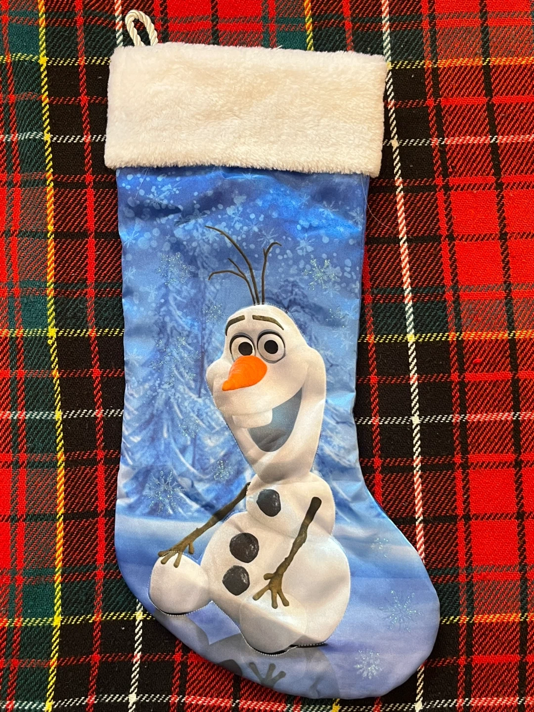 Get ready for the holidays with this adorable Disney's Frozen Olaf Christmas stocking! It features Olaf on a light blue background with a white faux fur trim. Perfect for any Frozen fan! Pickup only, near Oakland’s elementary school