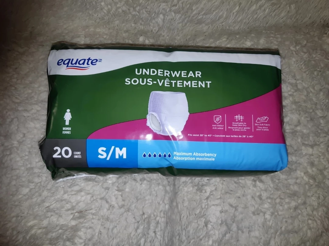 Selling a package of Equate brand underwear for women, size S/M. The package contains 19 count. Used only 1. These fit waist sizes 28" to 40" and offer maximum absorbency.