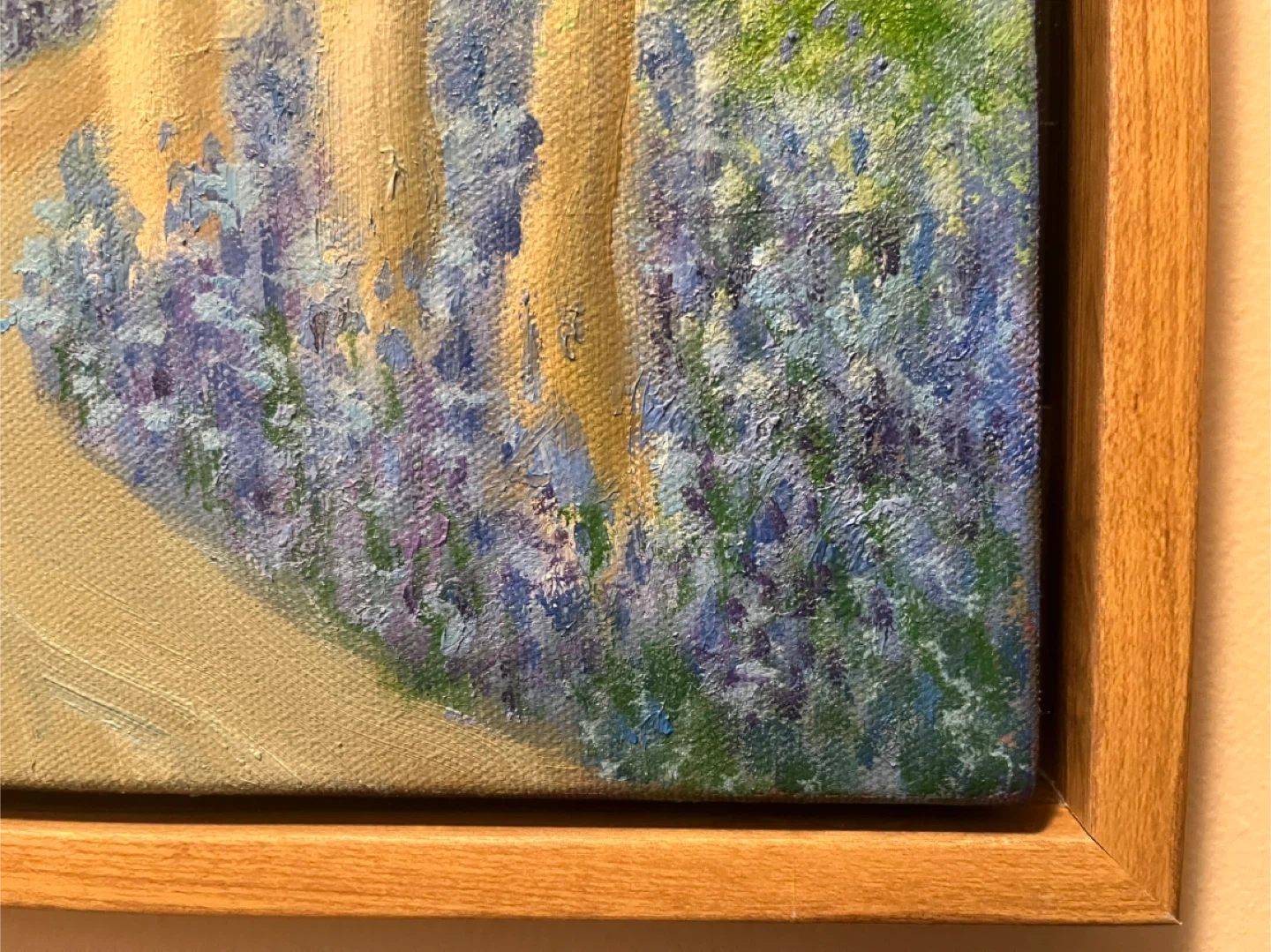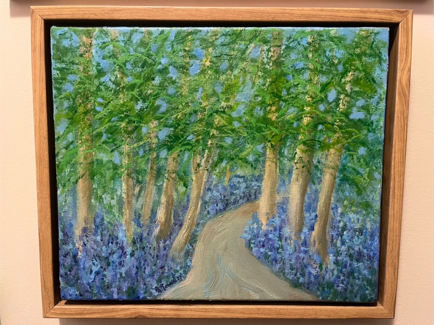 “A Walk Amongst the Bluebells”, 10x12, oil on canvas, by a local artist (the seller). Framed in a light complimentary coloured wood-look floater gallery style frame.