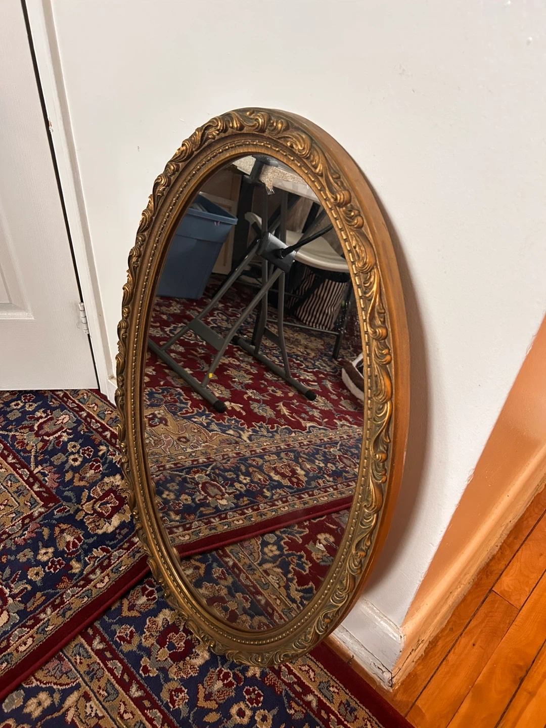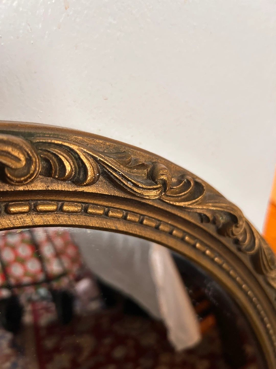 Selling a lovely ornate oval framed mirror. It would look great in any room! Great item for your antique collection.