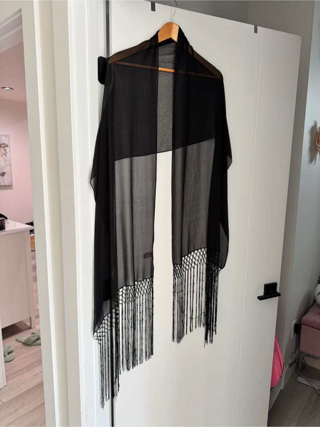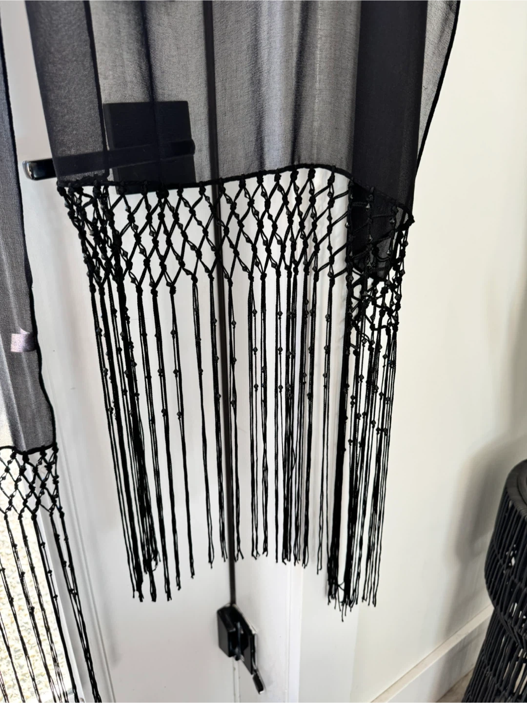 Selling a lovely black shawl with fringe detailing! It's in perfect condition and would be a stylish addition to any outfit