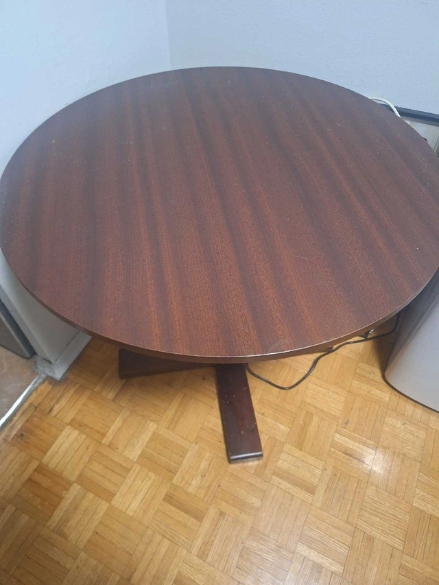 This round table features a sturdy construction and classic design, perfect for a kitchen nook or small dining area. It's in good condition, ready to add charm to your home. If the ad is up, the table is available!