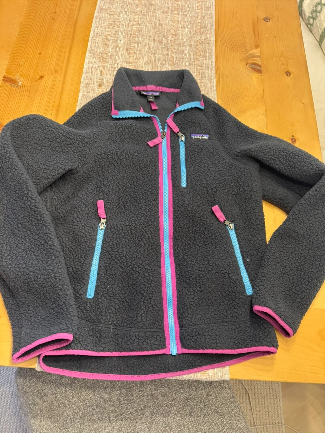 Cozy black Patagonia fleece jacket up for grabs! It features a full zip with vibrant pink and blue accents. Perfect for layering or wearing on its own during those cooler Canadian evenings. It's in great condition and ready for a new home!