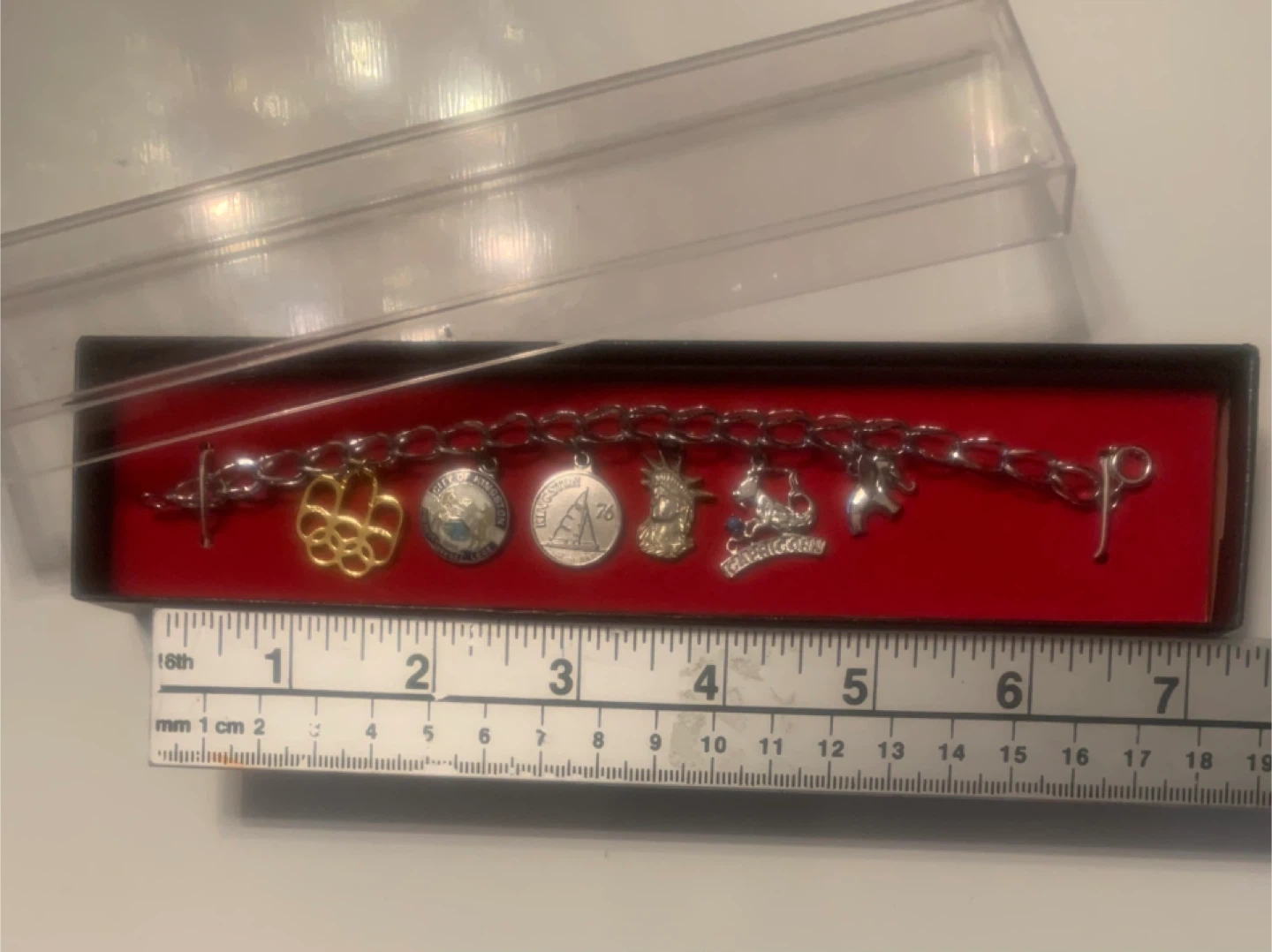 Selling a vintage charm bracelet featuring Kingston-themed charms. Some charms are sterling silver. It comes in a box!