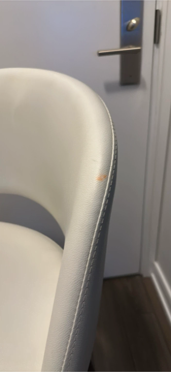Selling a set of 2 stylish counter stools with a white leather seat and a dark metal frame. It's in great shape and would look lovely in any kitchen or bar area. There is a slight stain on one of the chairs, as shown.