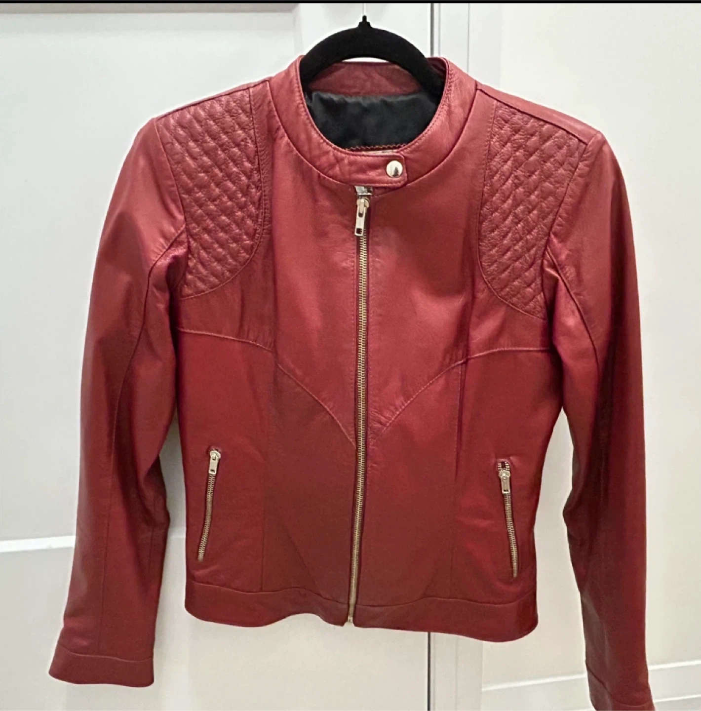 Selling a stylish genuine red leather jacket. This jacket is new and features a unique quilted design on the shoulders and back. It's a size Small, perfect for adding a pop of colour to your wardrobe!
